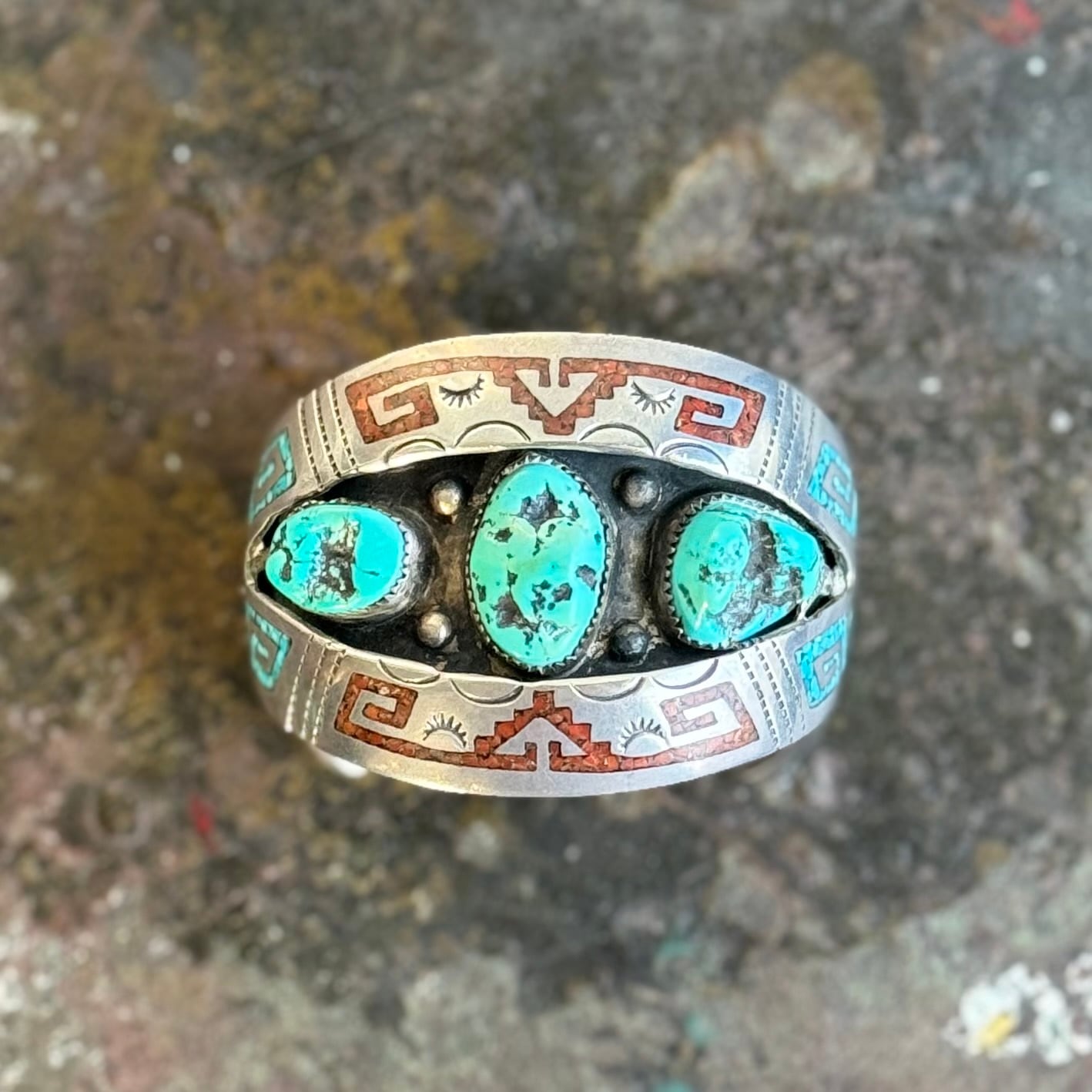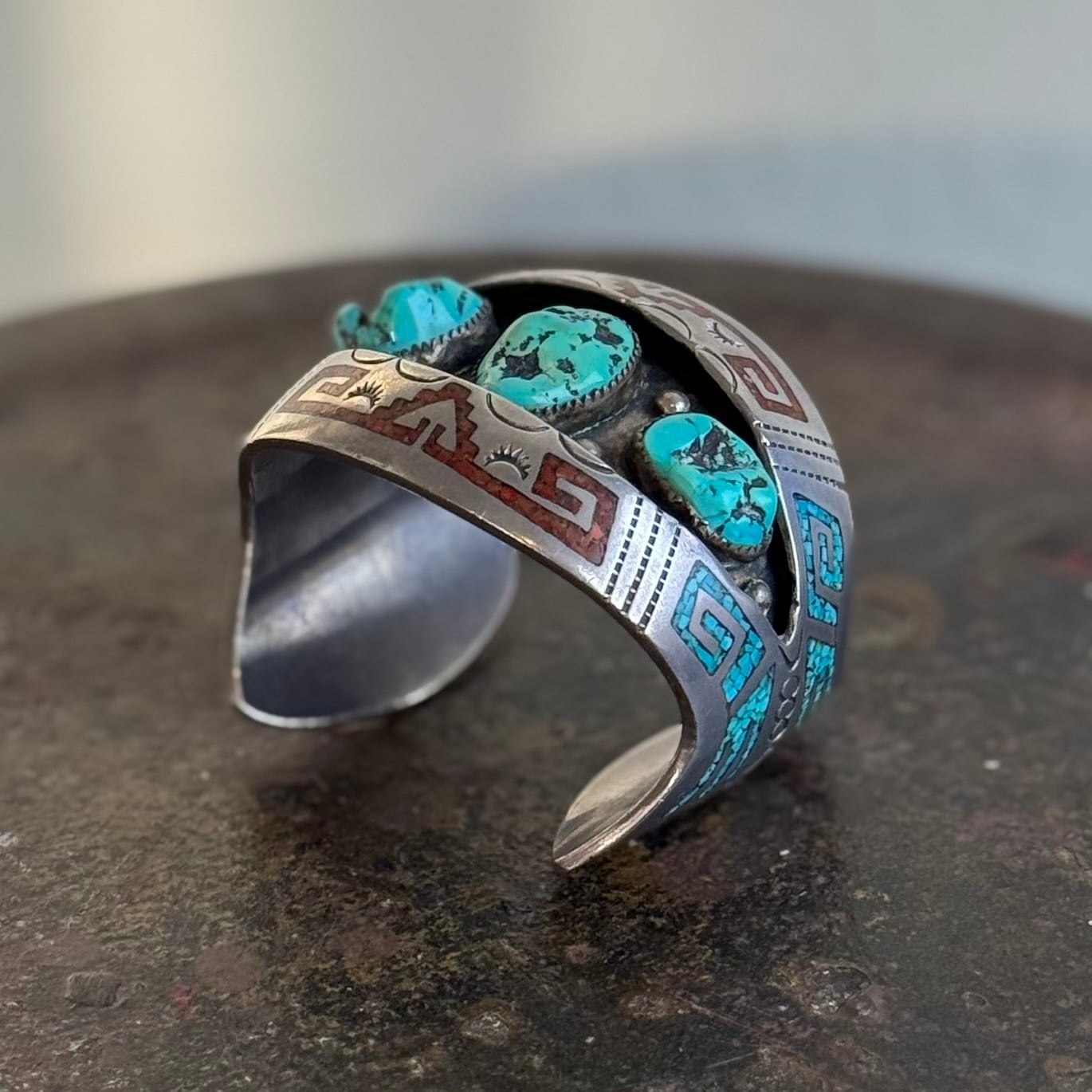 バングル部分全体のモチーフに、インレイ技法でストーンが埋め込まれており、沢山のスタンプワークも見られます。