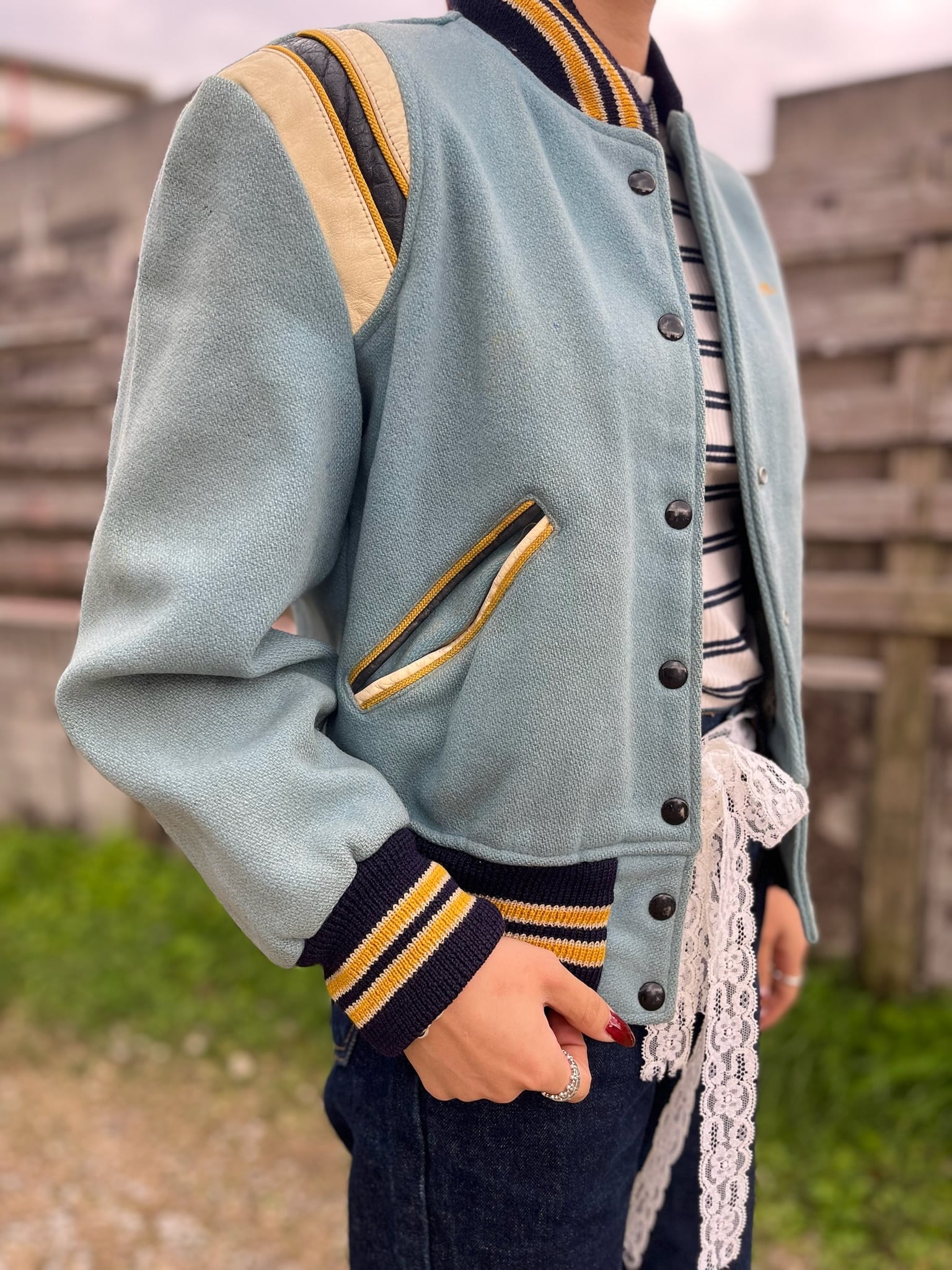 淡い水色×レトロなイエローのビビッド過ぎないカラーの組み合わせとなっており、デニムにはもちろんスカートやワンピースとのコーディネートにもオススメです。