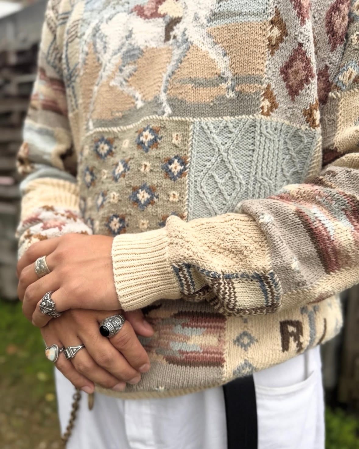 チェック、フラワー、幾何学、ネイティブ柄、ケーブル編みなど、複数の編み地と柄を一着に落とし込んだパッチワークデザインは、量産では出せない存在感。