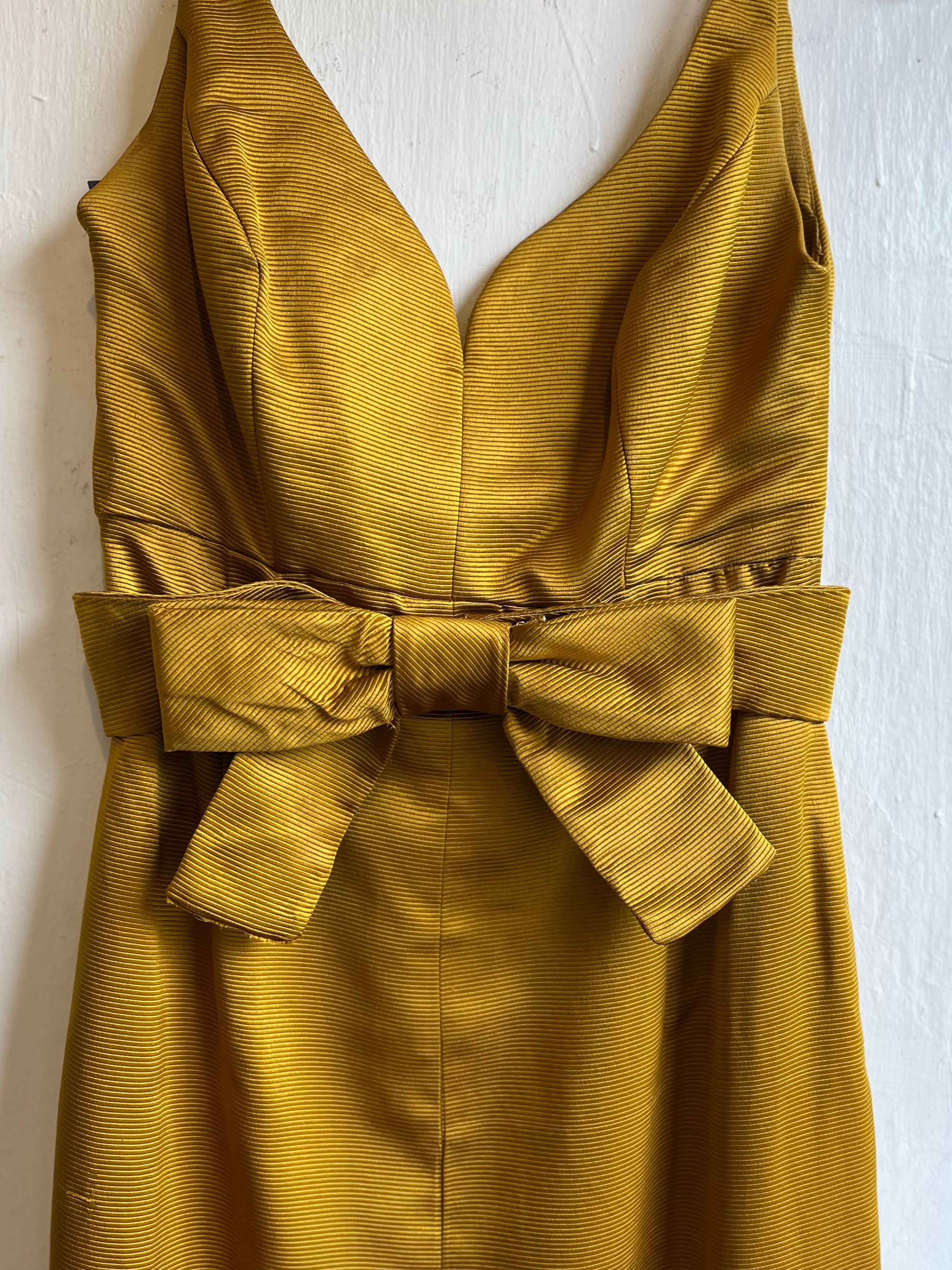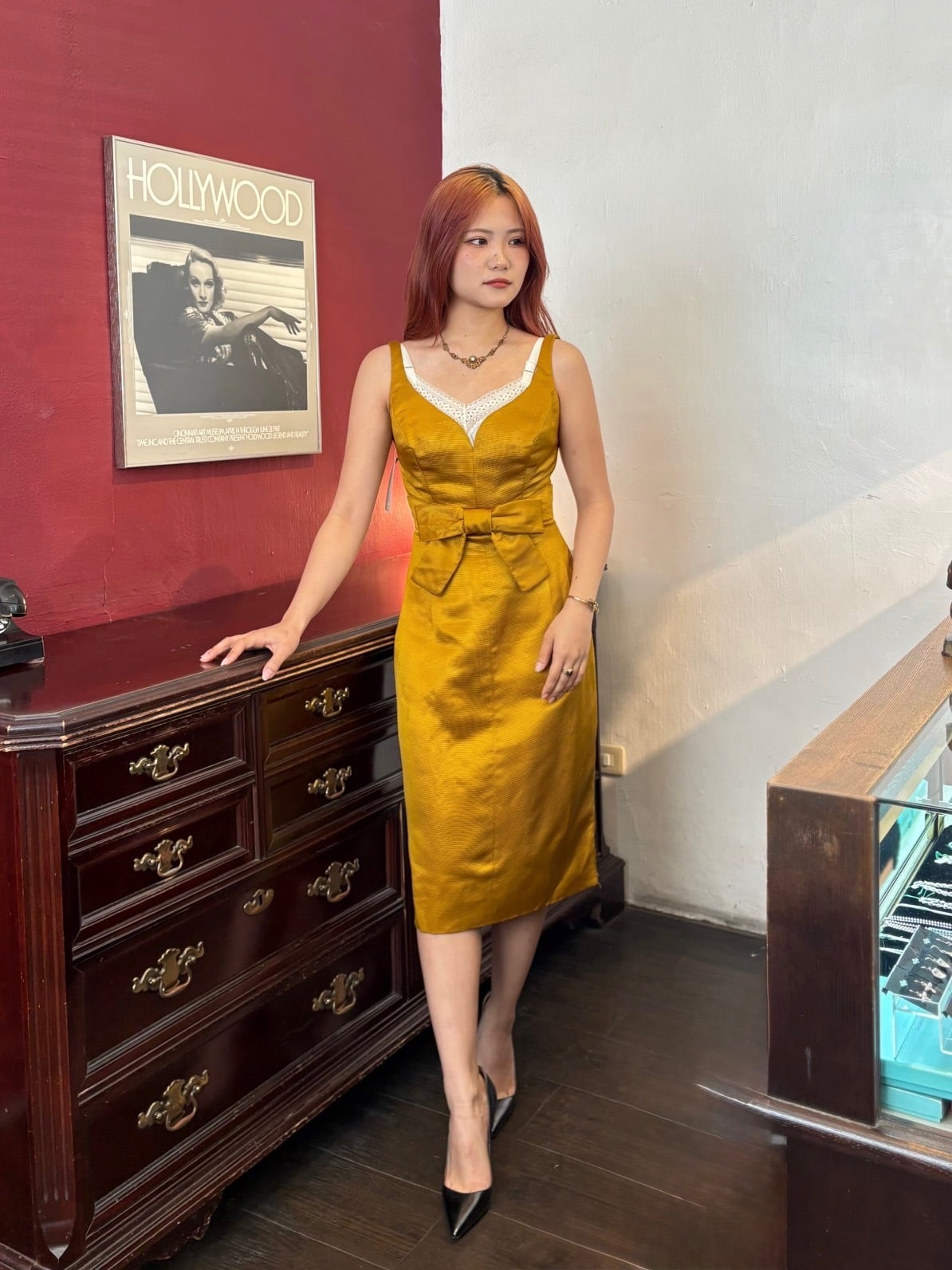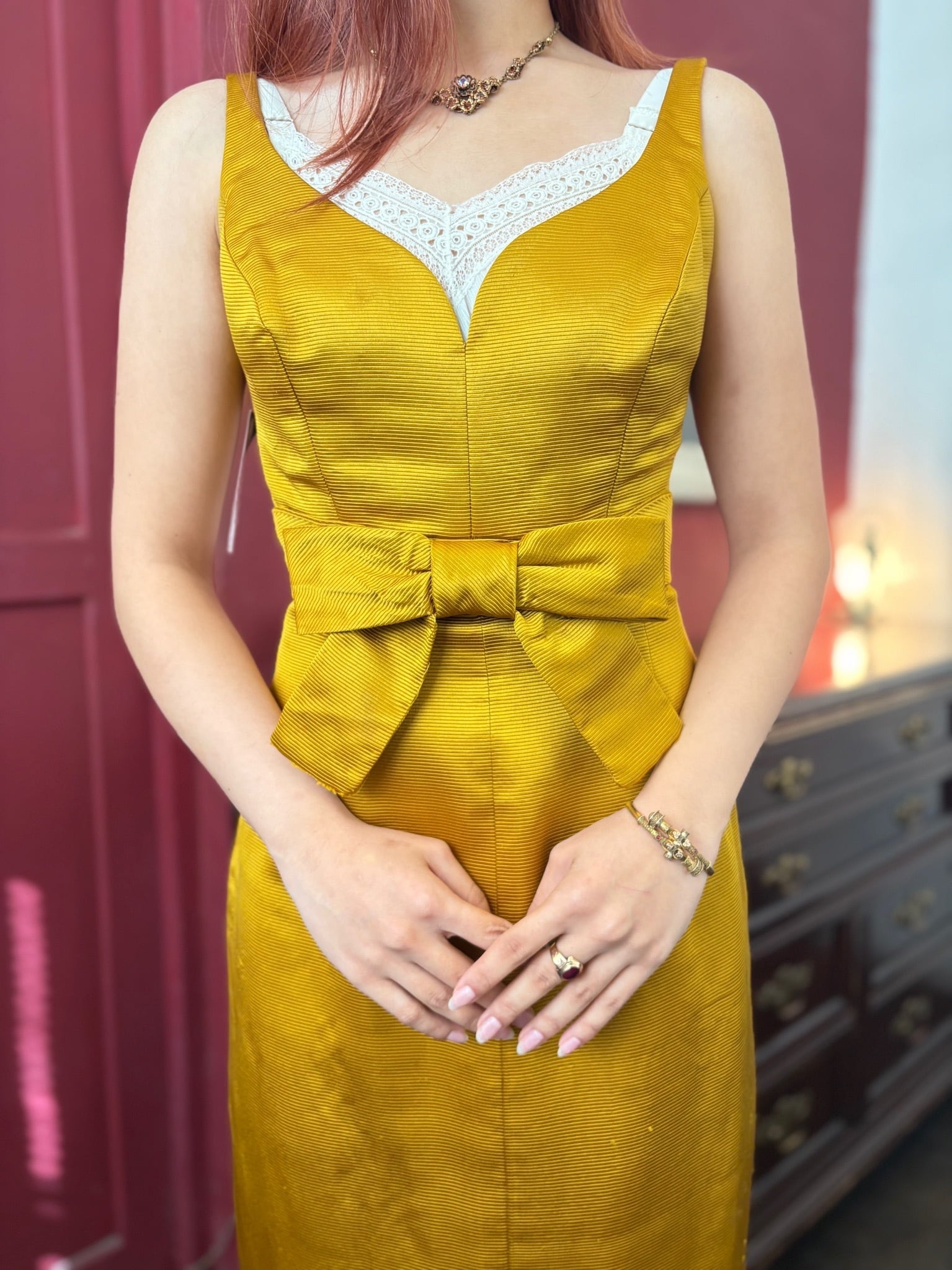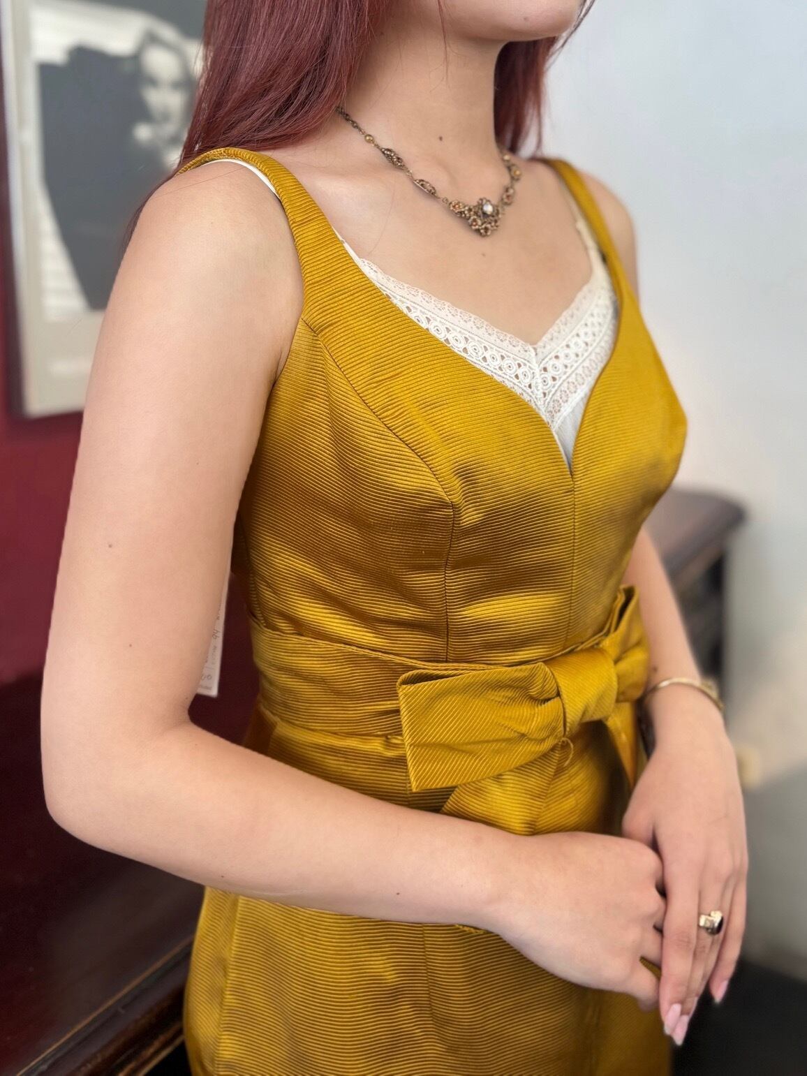 艶やかなマスタードゴールドの生地を使用し、女性らしいボディラインを美しく引き立てるタイトシルエットが魅力の一着です。