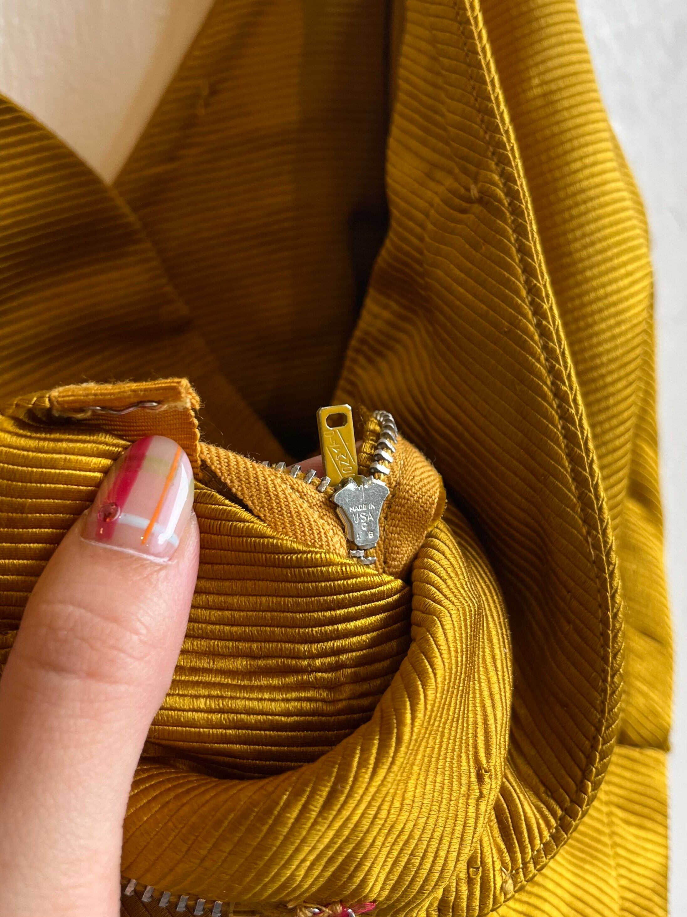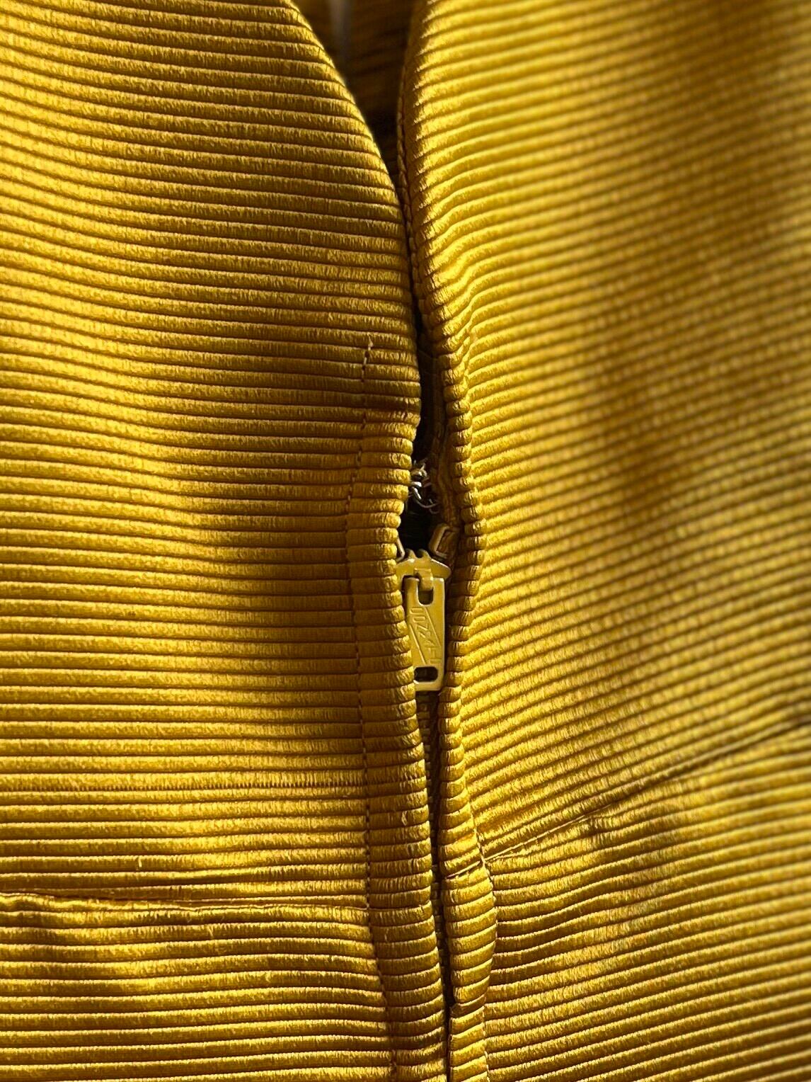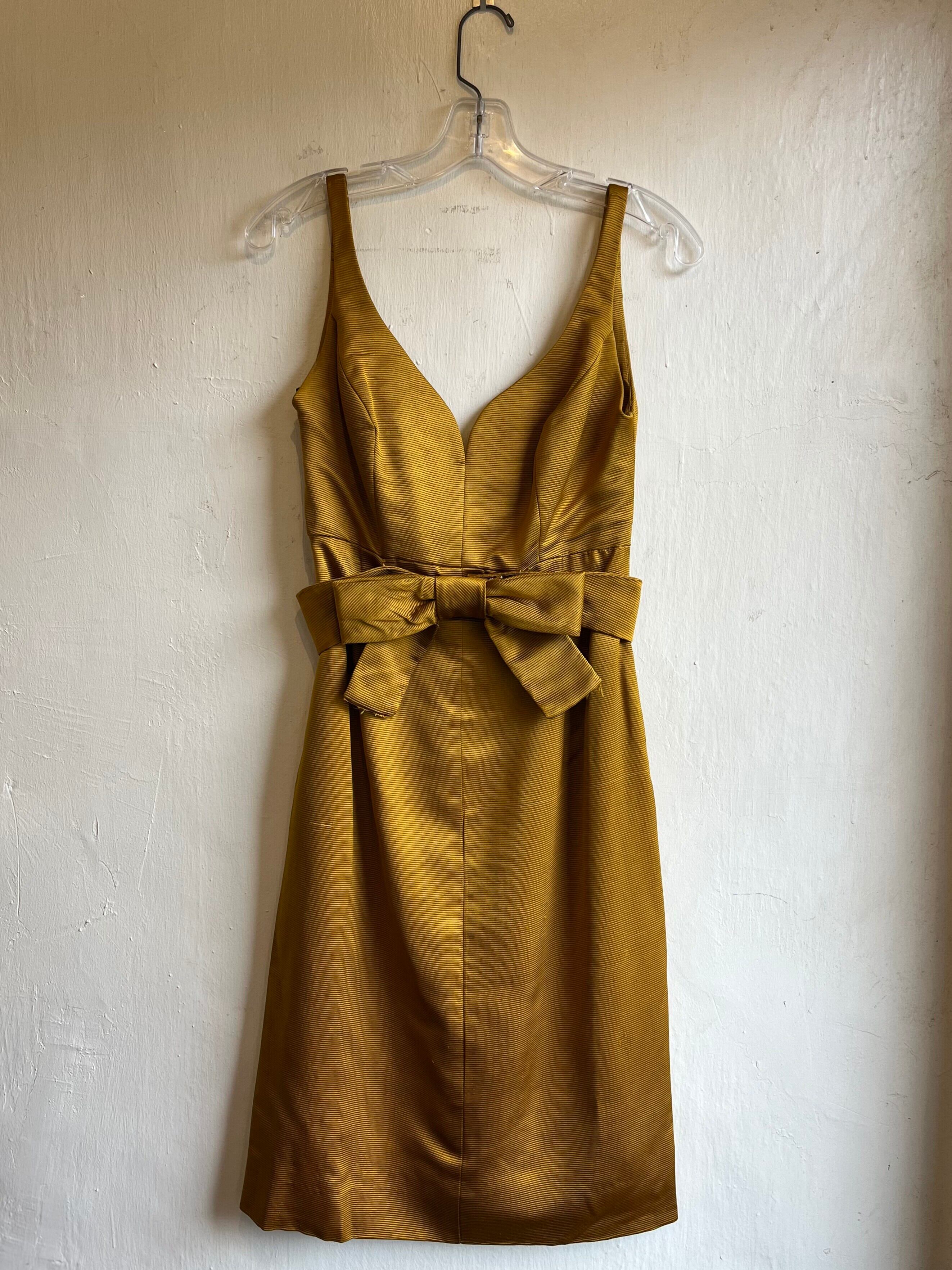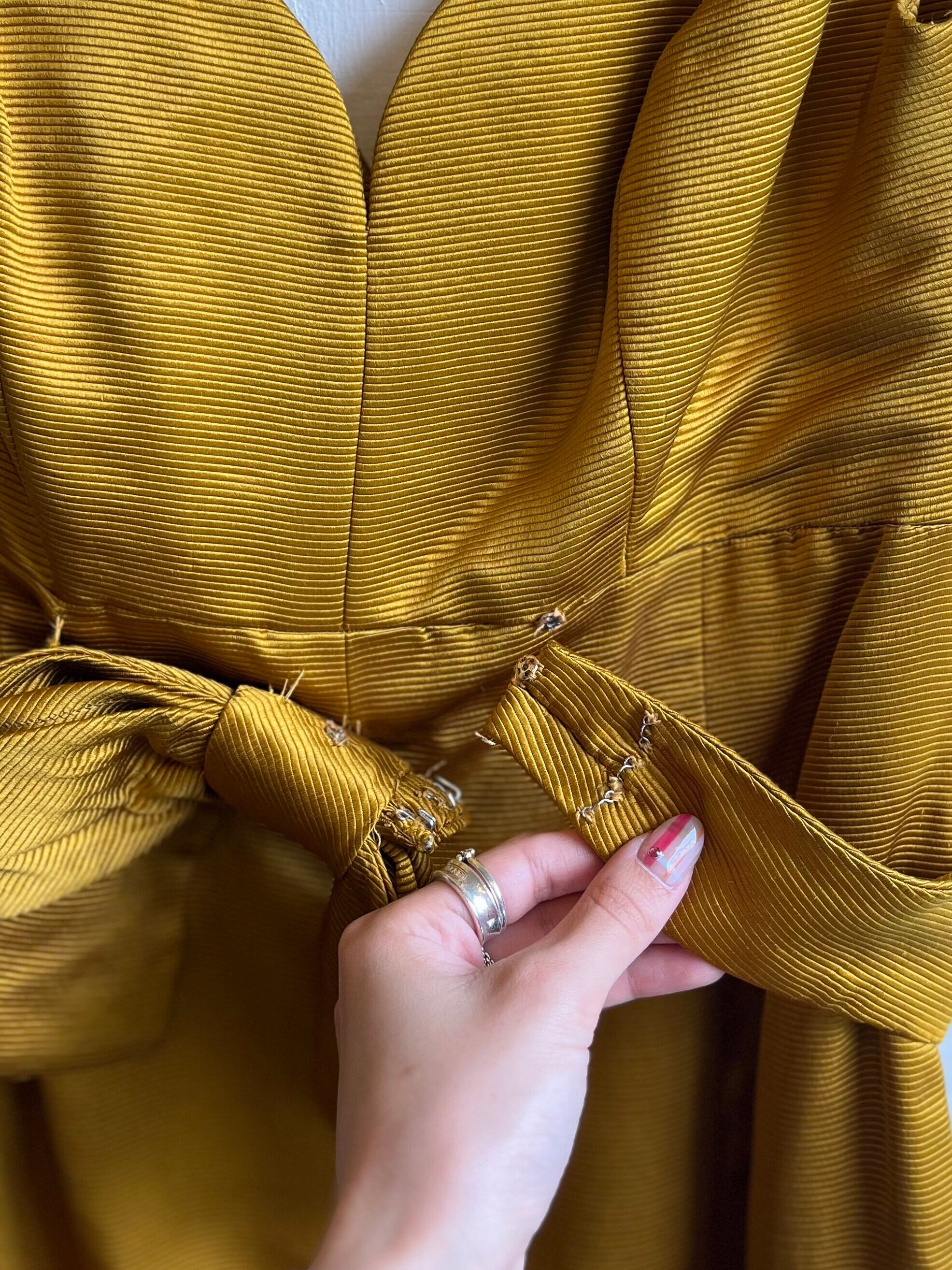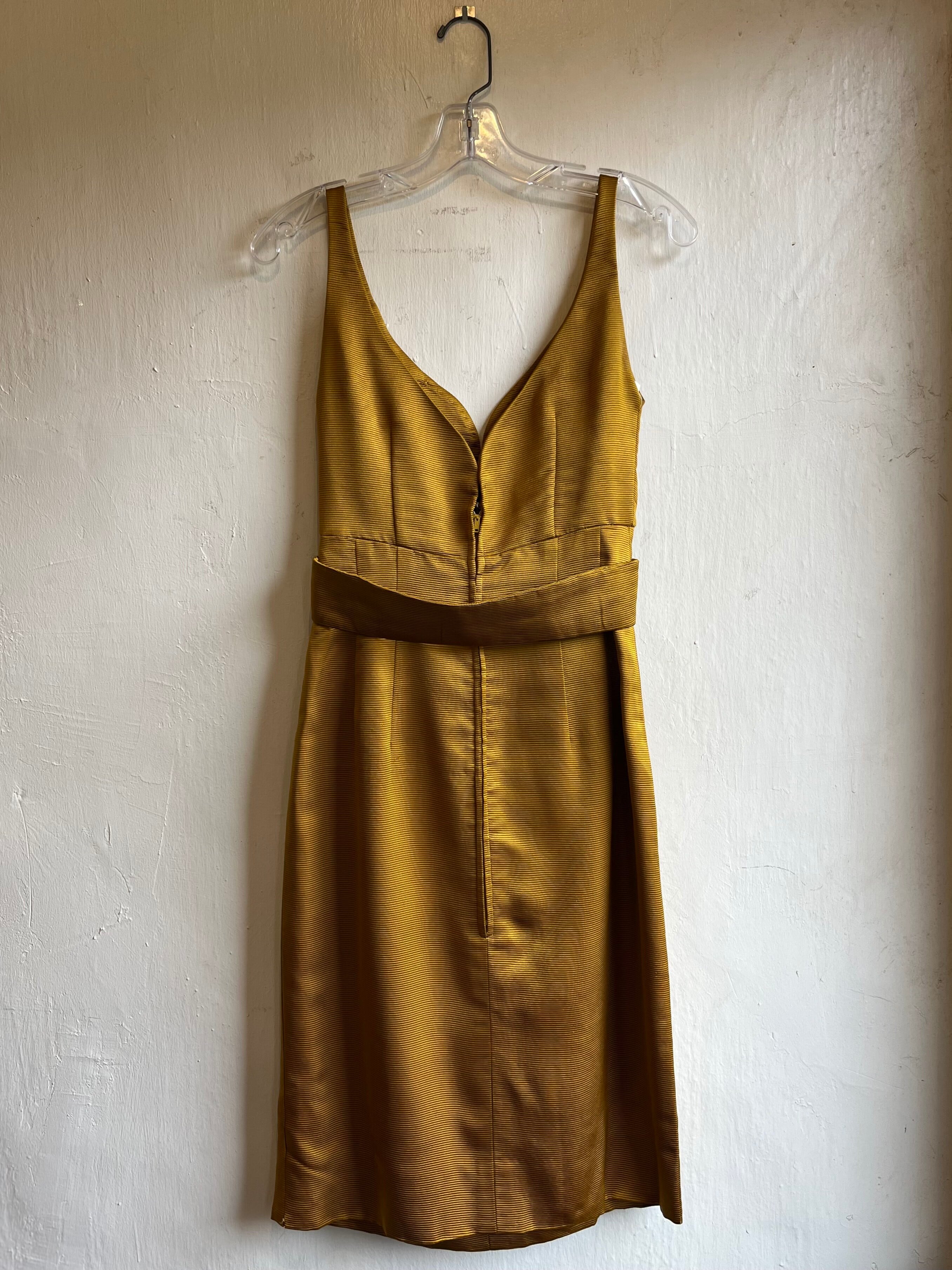 艶やかなマスタードゴールドの生地を使用し、女性らしいボディラインを美しく引き立てるタイトシルエットが魅力の一着です。
