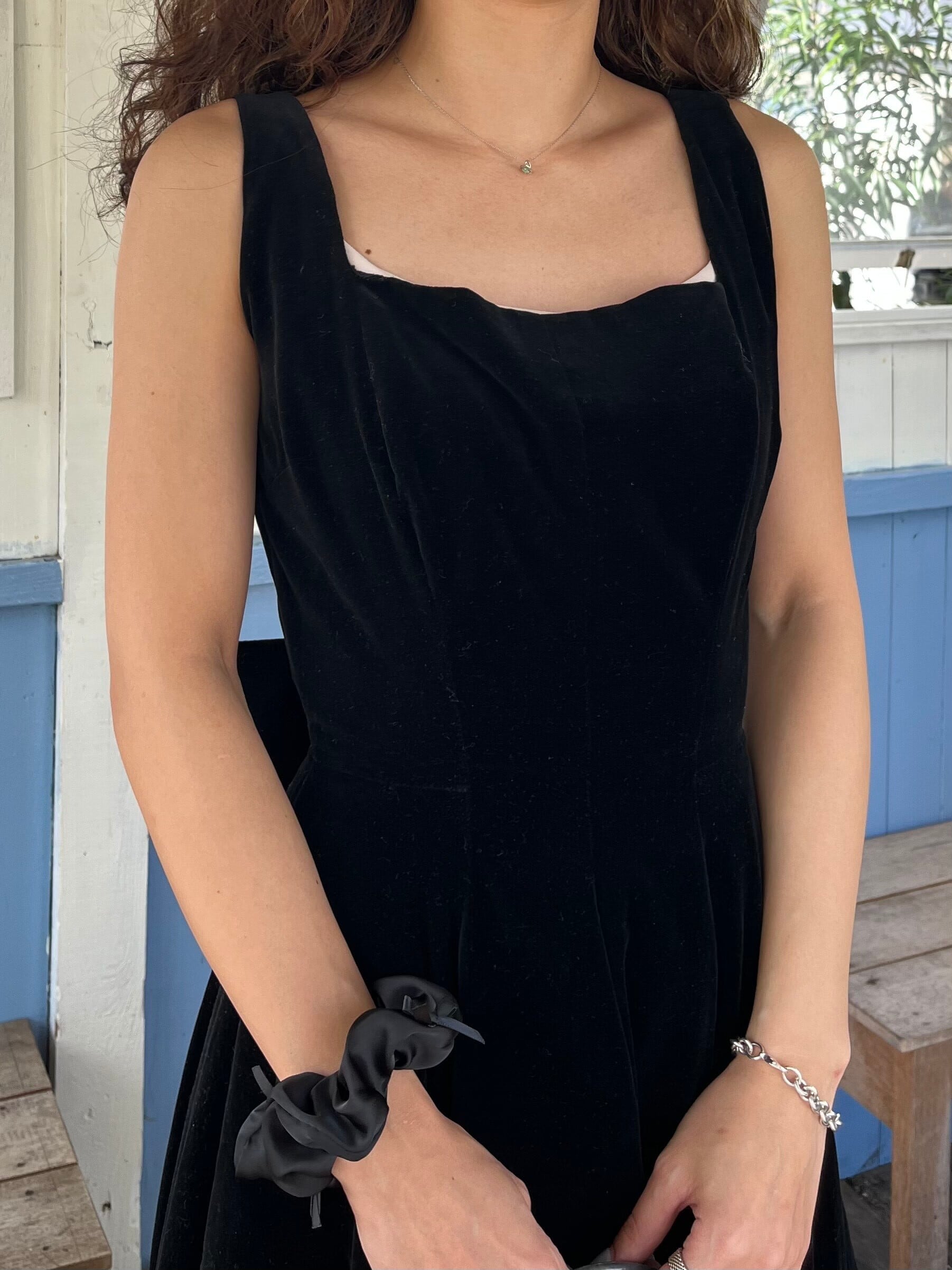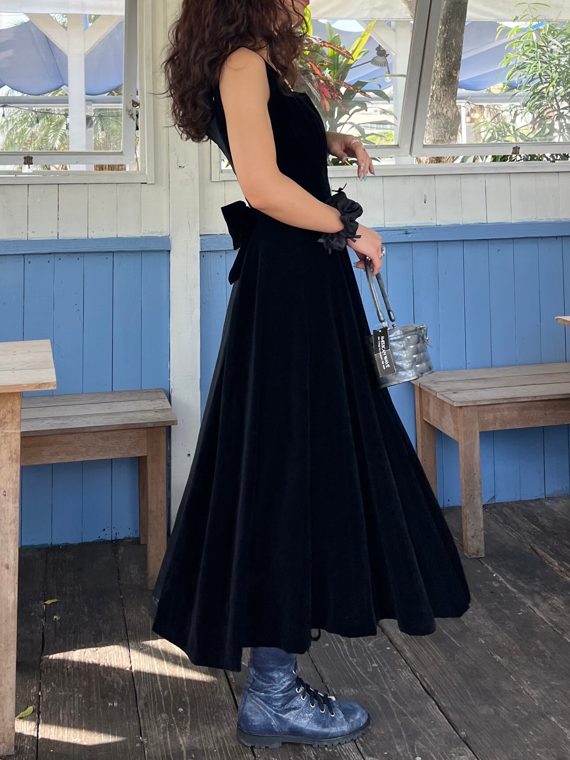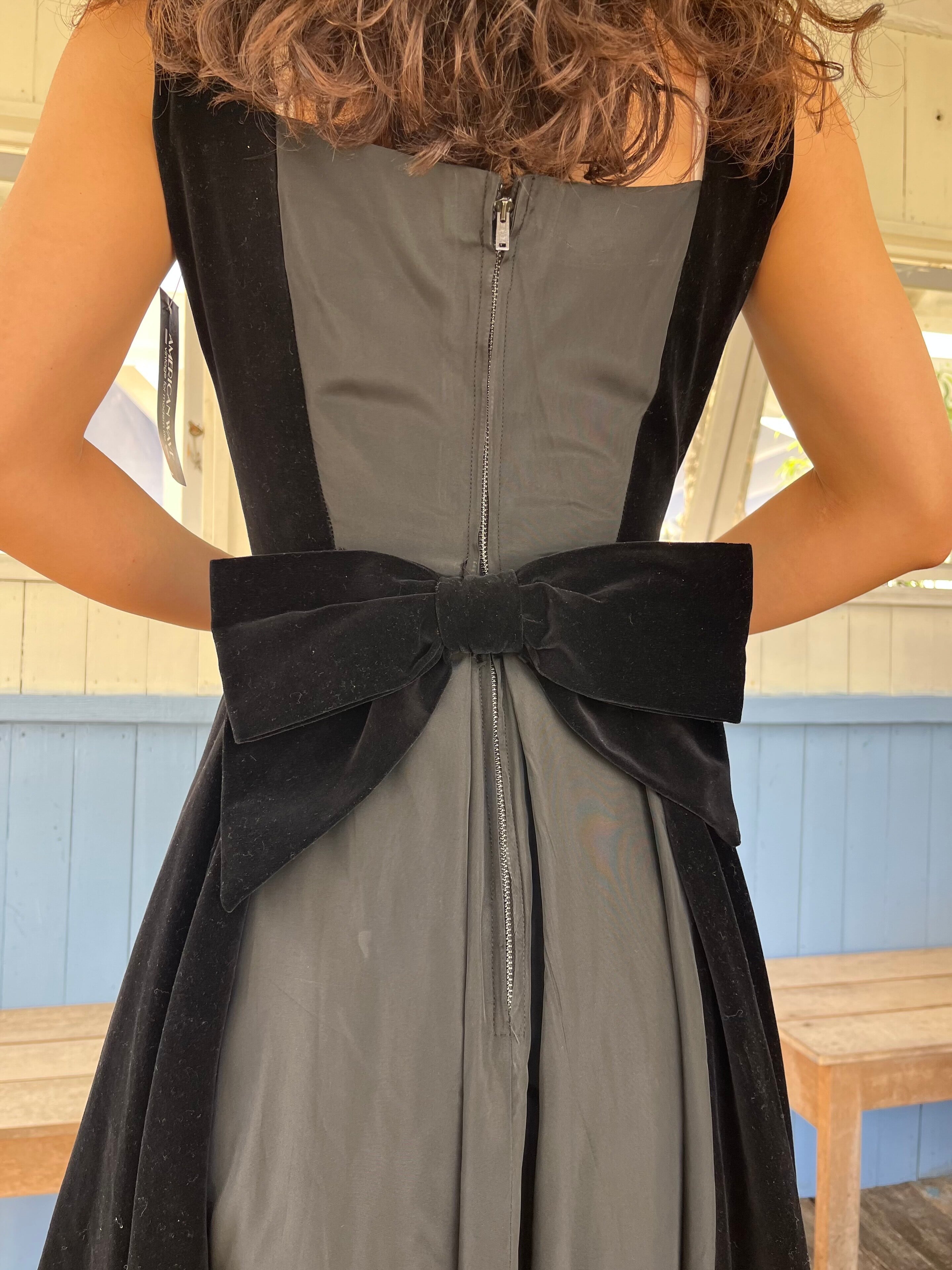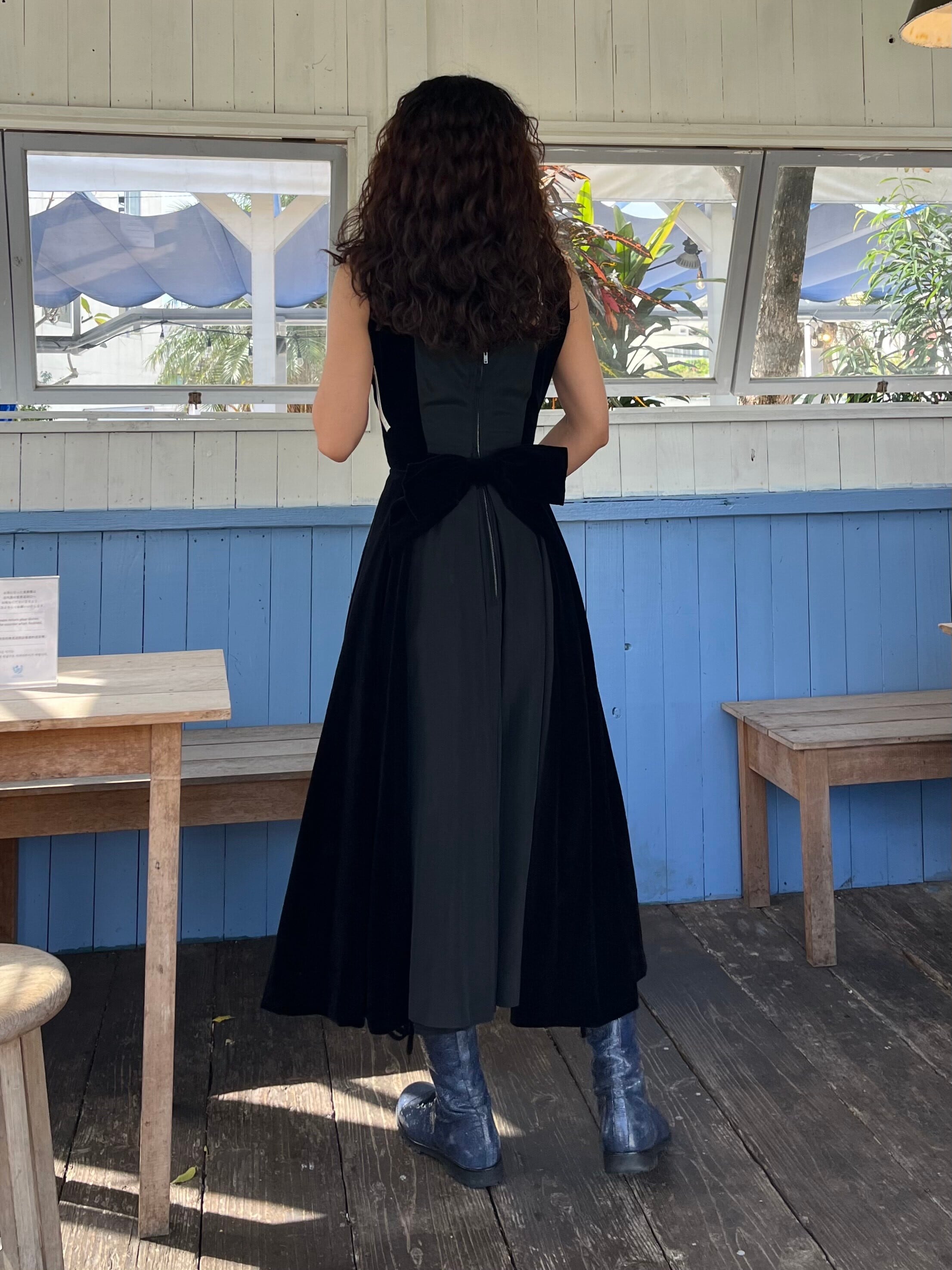ベルベットとナイロンの2種の生地から作られており、バイカラーのような組み合わせで重すぎない印象となっており、背中の大きなリボンもドレスの存在感を惹き立たせてくれます。