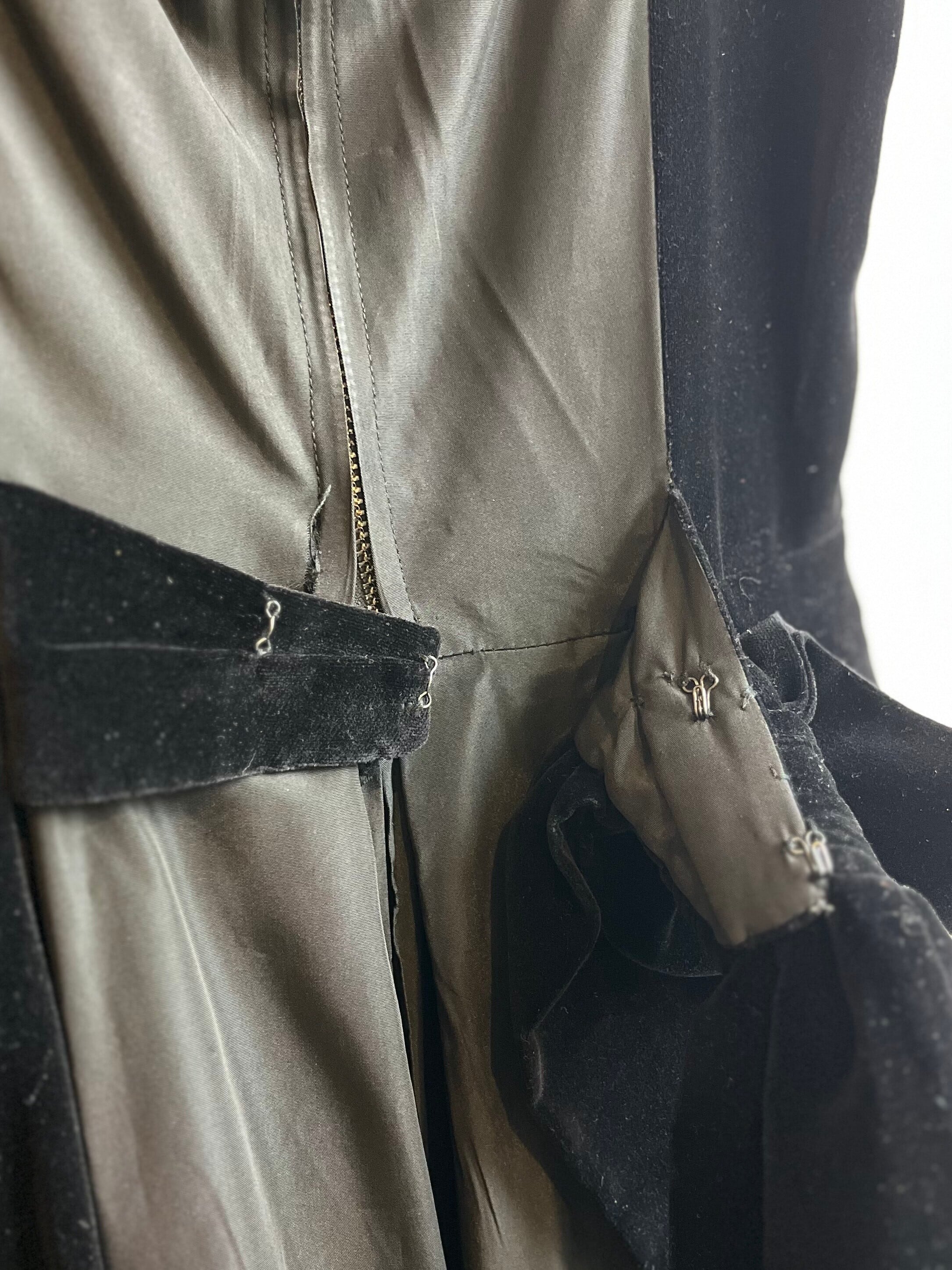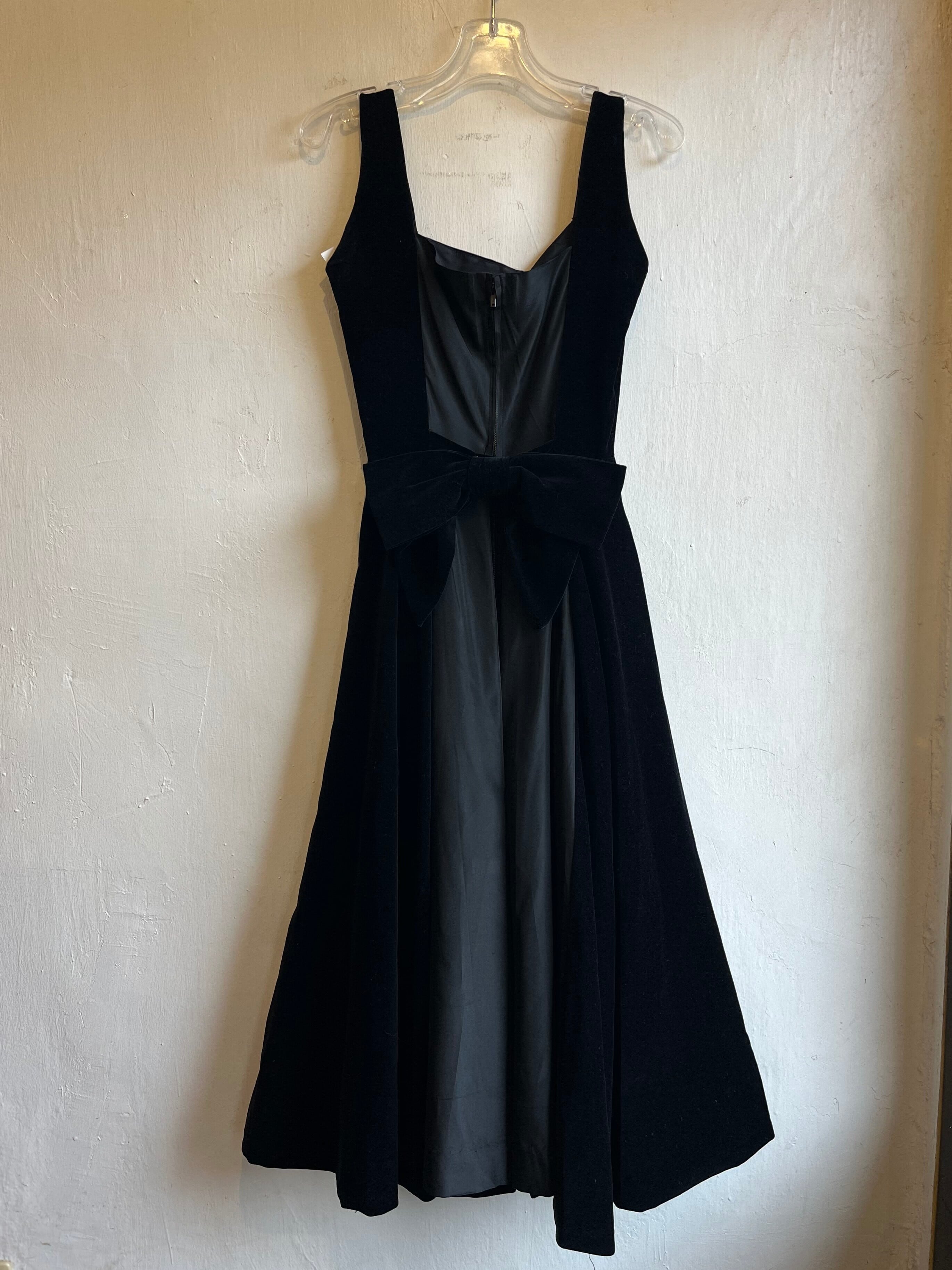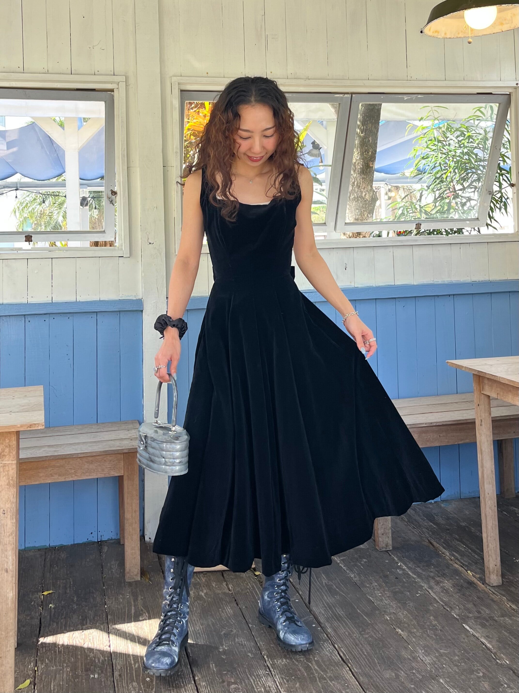 ベルベットとナイロンの2種の生地から作られており、バイカラーのような組み合わせで重すぎない印象となっており、背中の大きなリボンもドレスの存在感を惹き立たせてくれます。