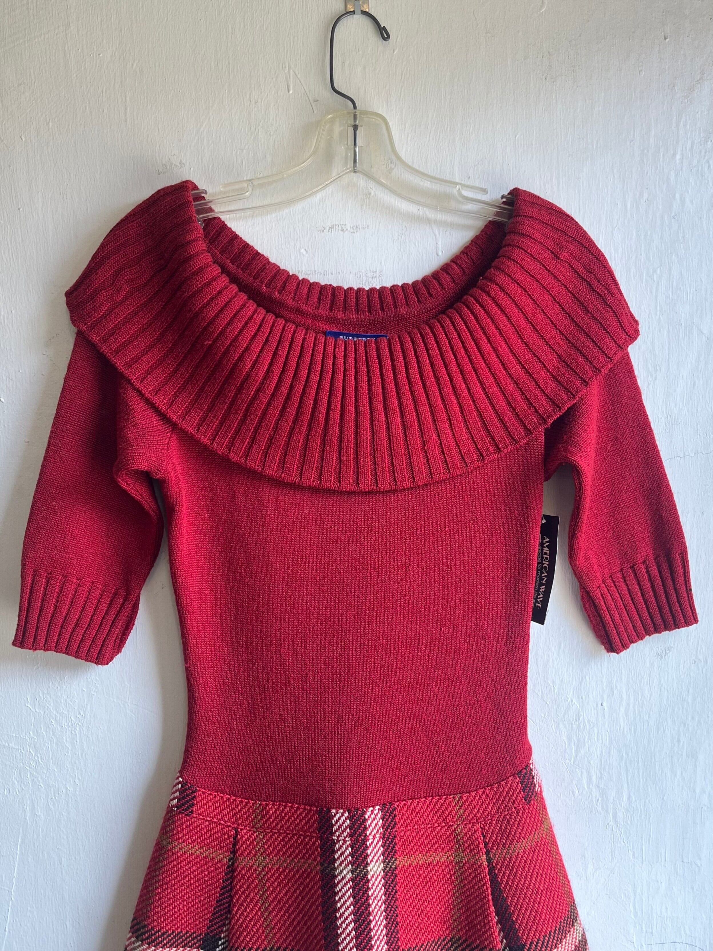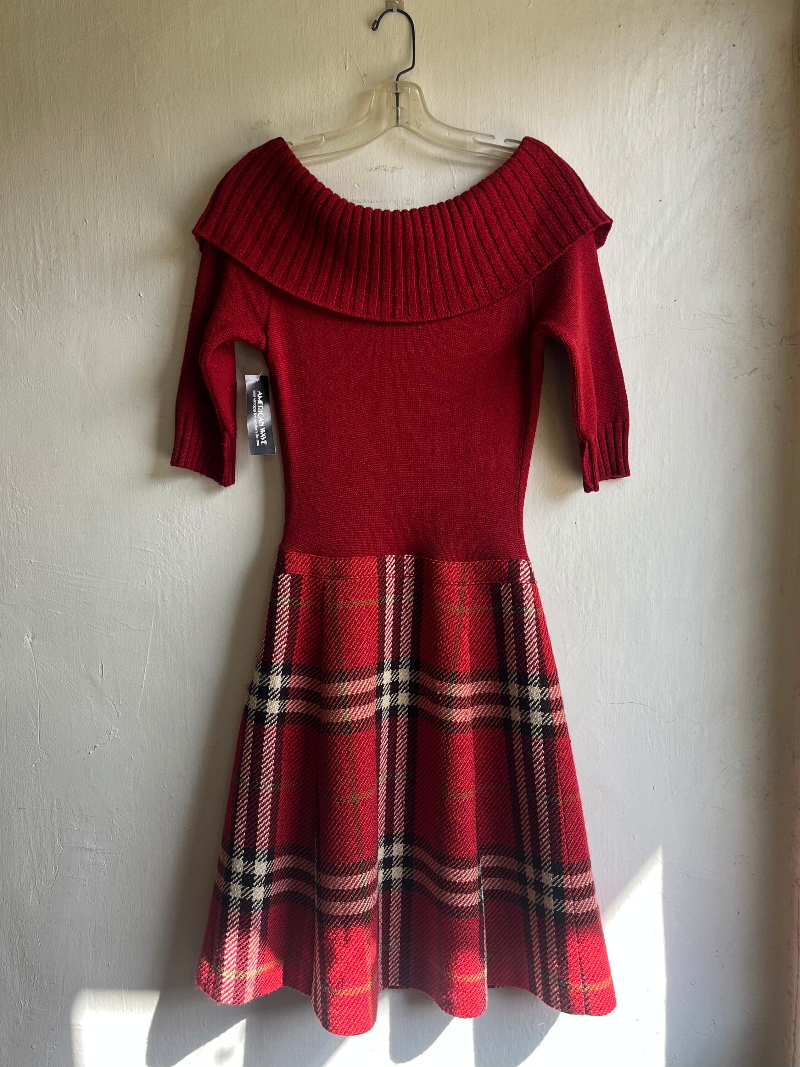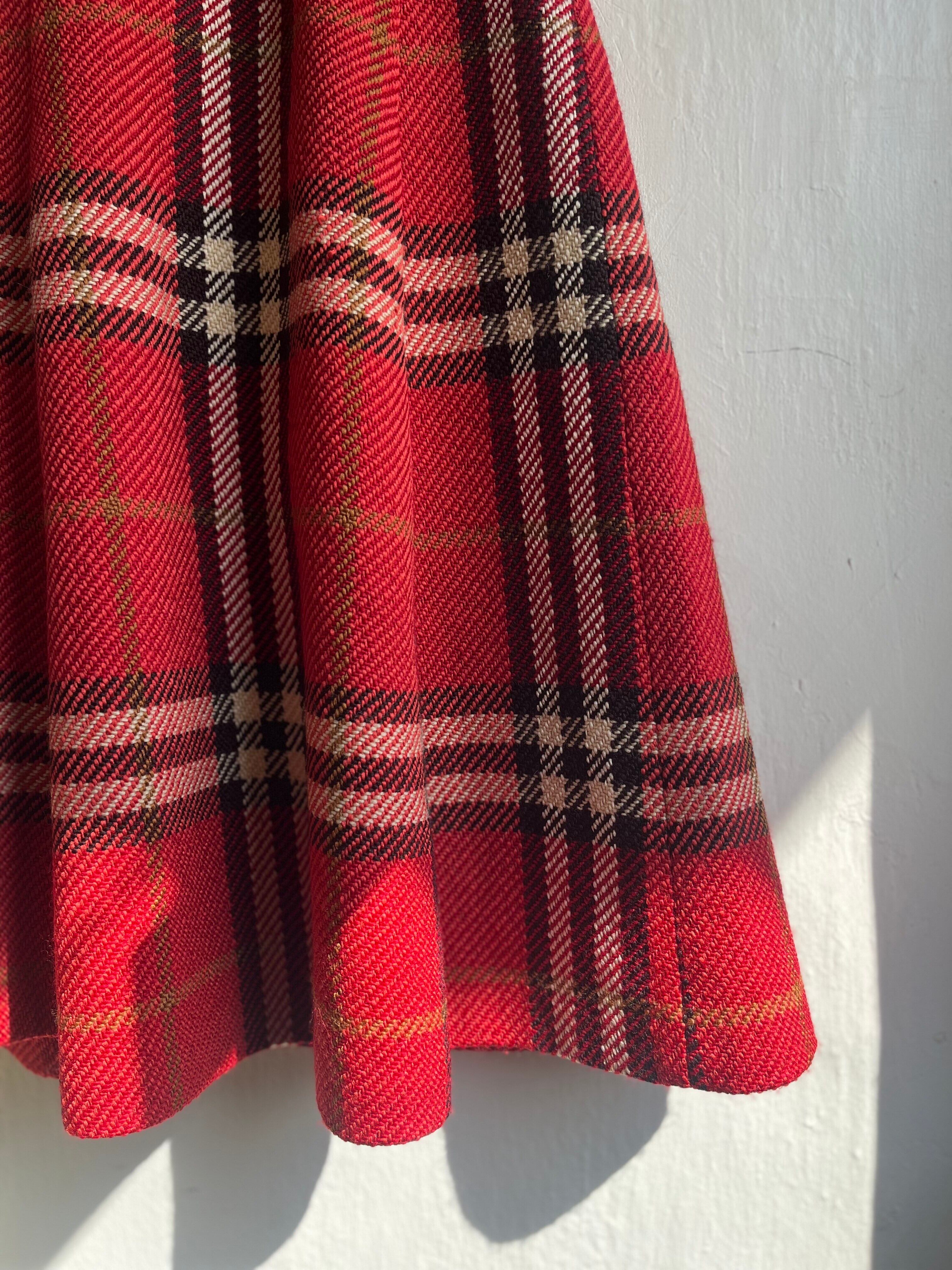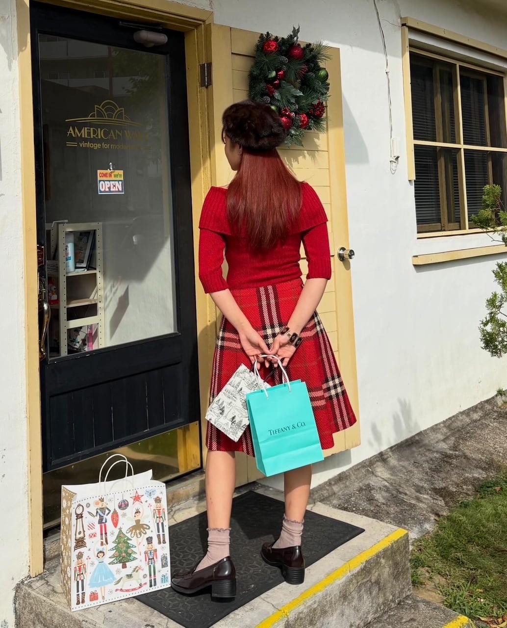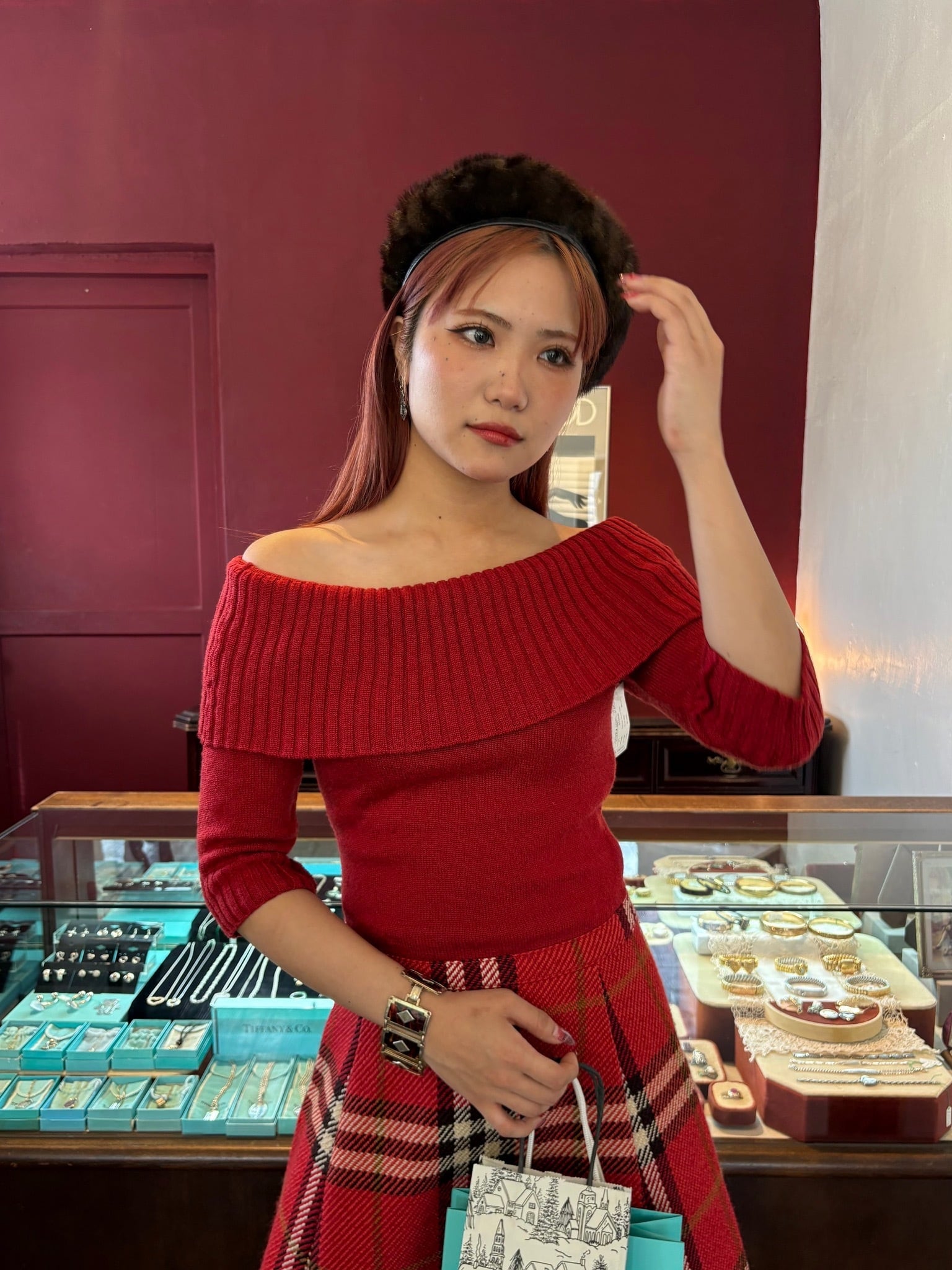 スカート部分は腰から裾にかけて緩やかに広がるAラインシルエットで、トップはリブニット素材のオフショルダー風デザインで、程よく身体にフィットし、チェック柄とのコントラストが美しいバランスとなっています。