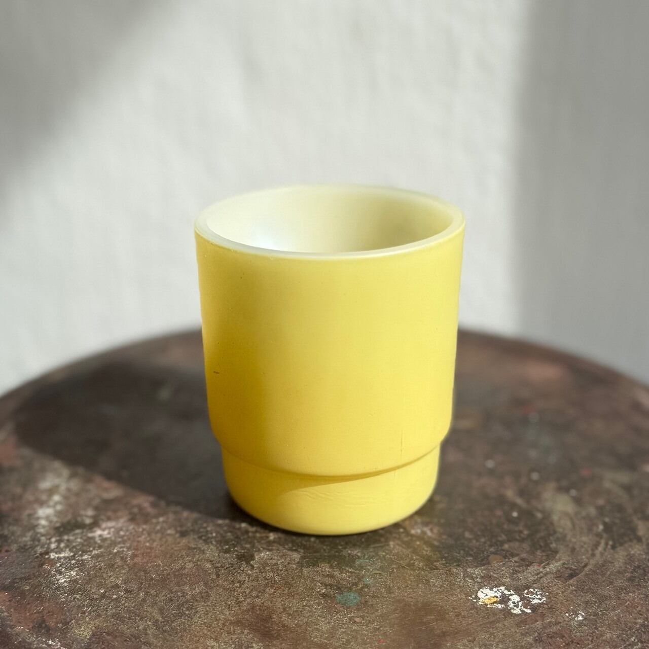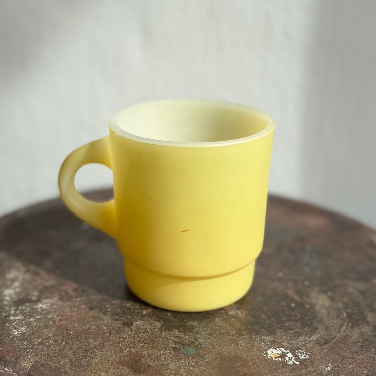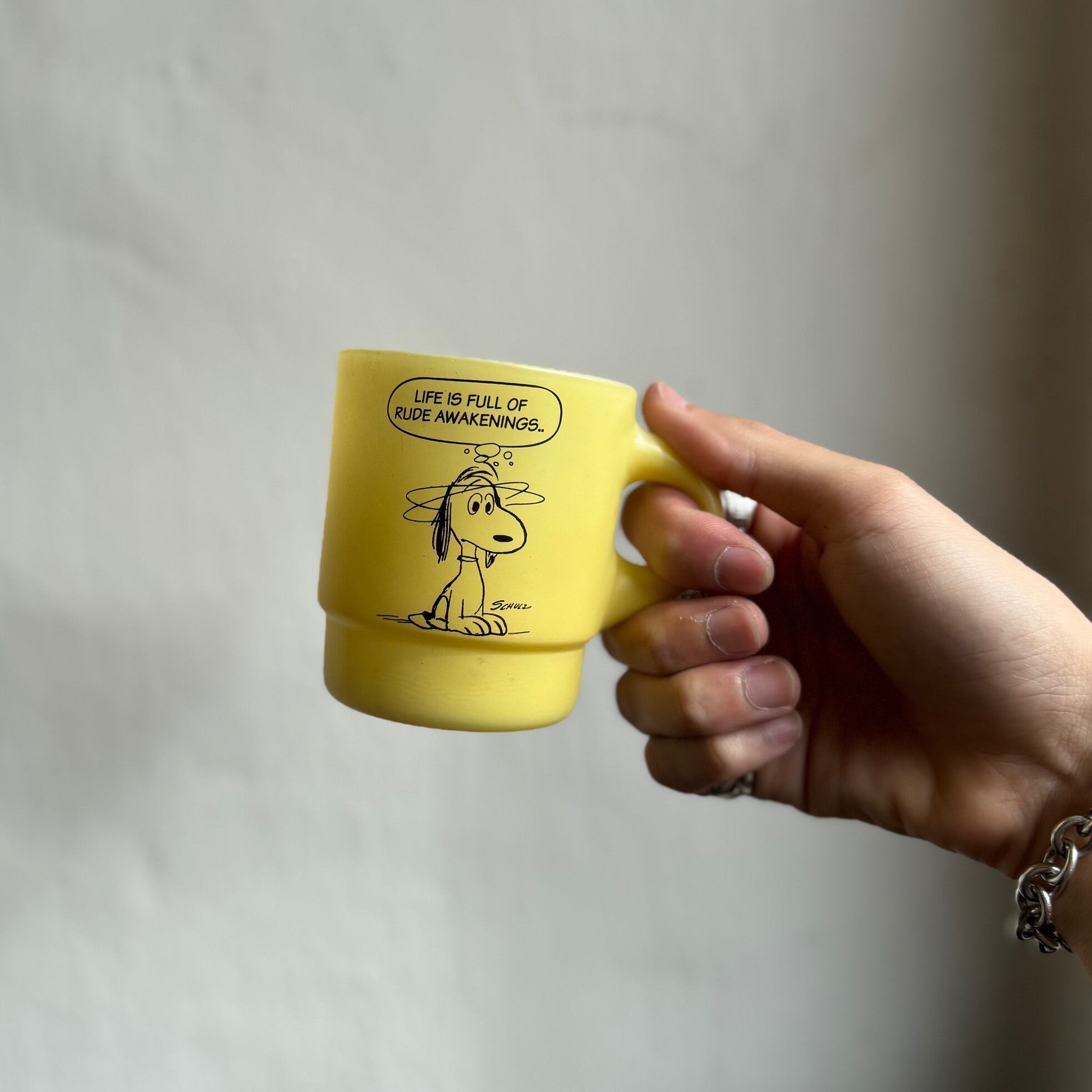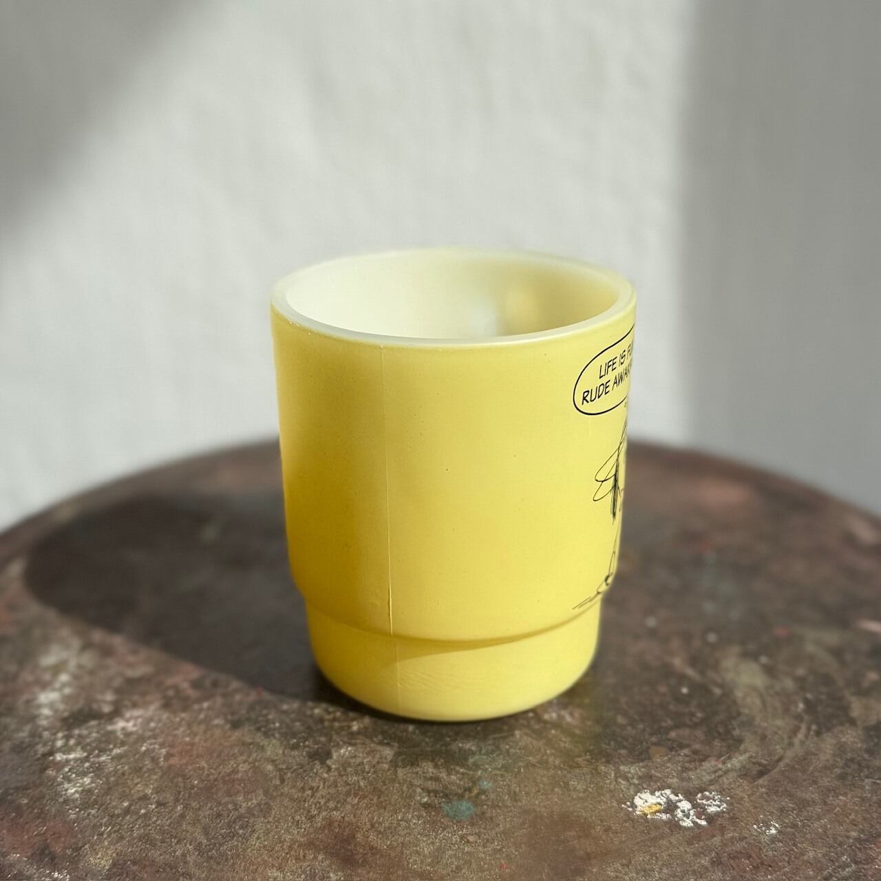 マットな質感のイエローカラーにスヌーピーが片面だけにプリントされたシンプルなマグ。