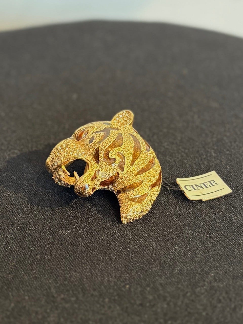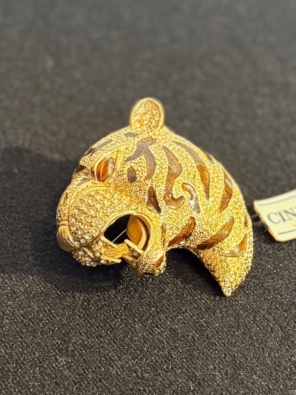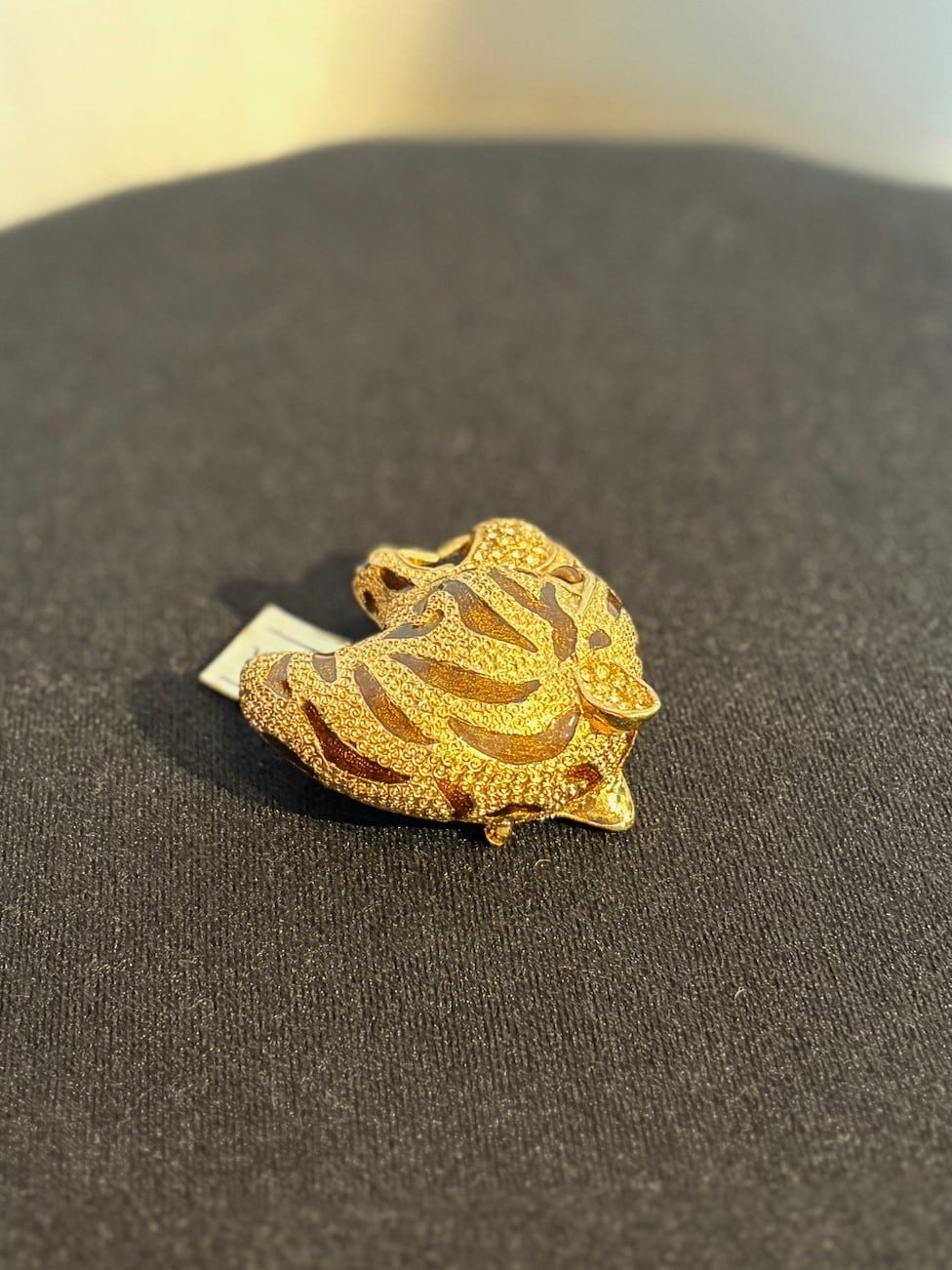 繊細な模様で施されたゴールドトーンとブラウン系エナメル装飾で表現された、力強い表情のタイガーモチーフブローチです。