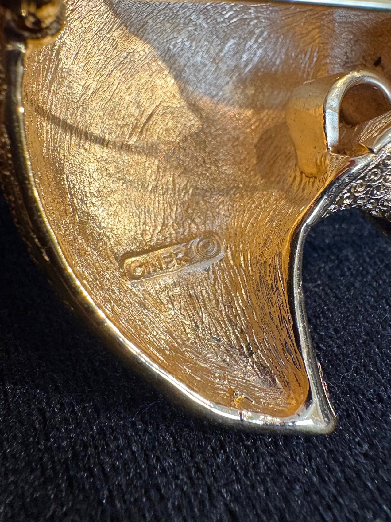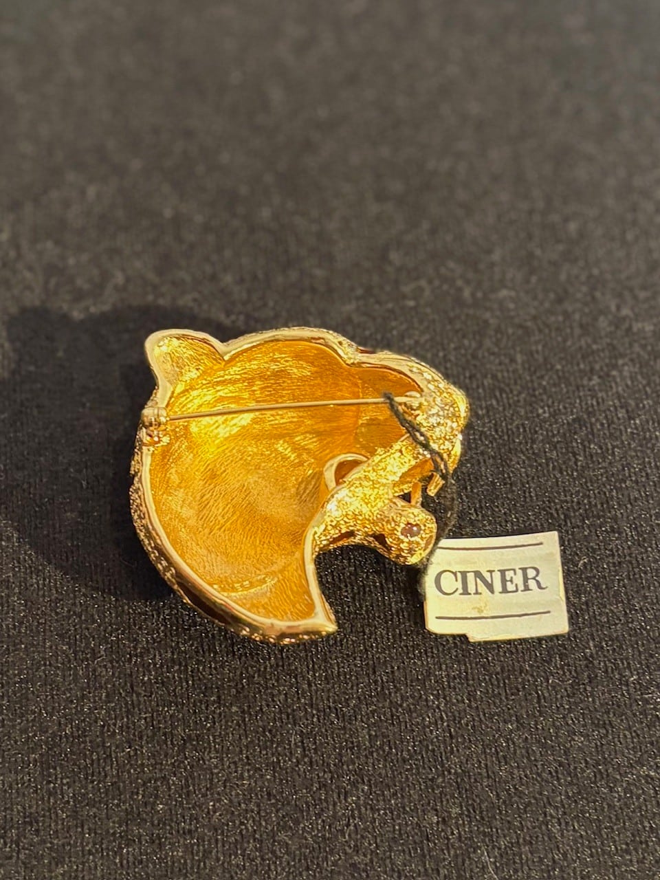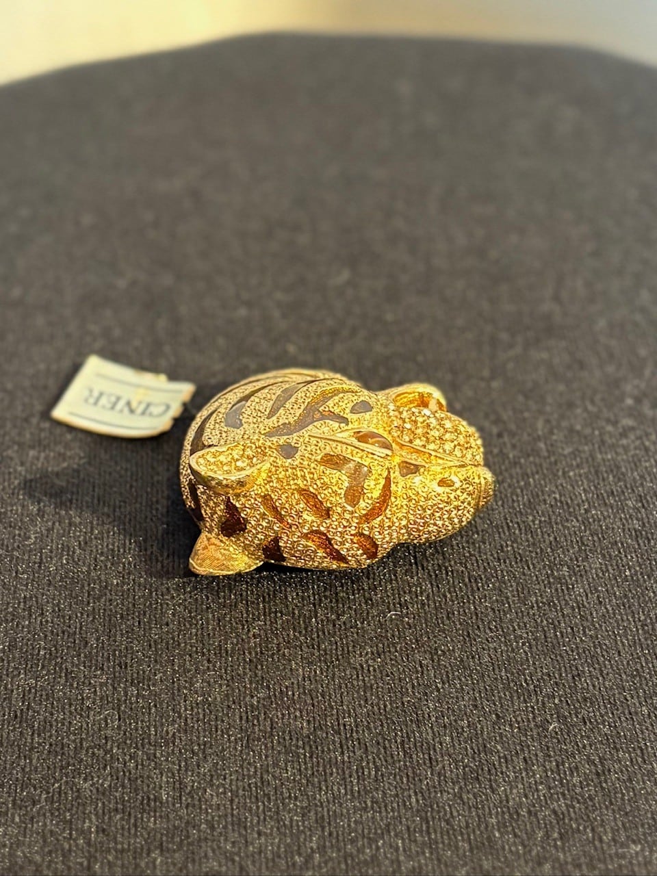 繊細な模様で施されたゴールドトーンとブラウン系エナメル装飾で表現された、力強い表情のタイガーモチーフブローチです。