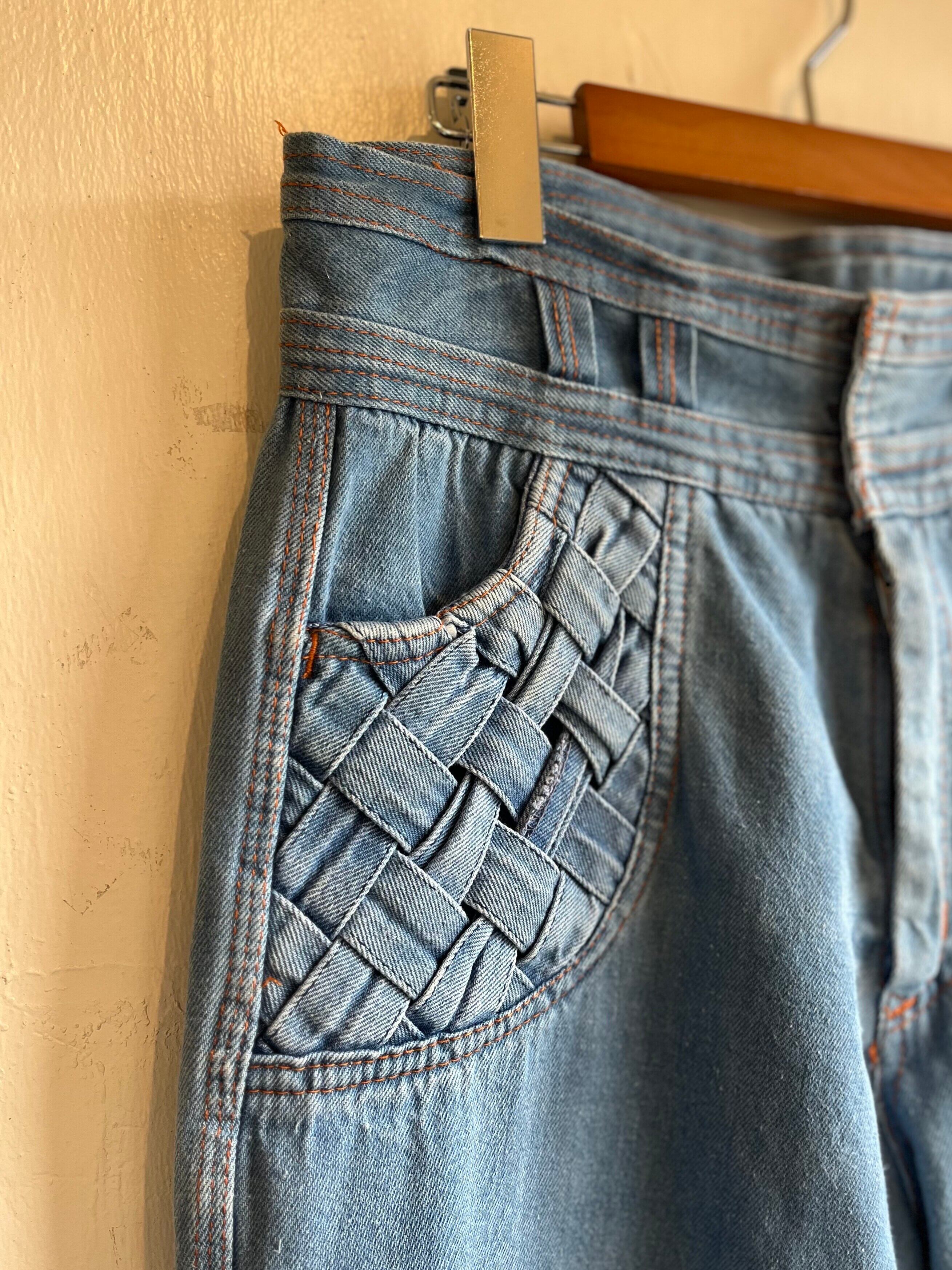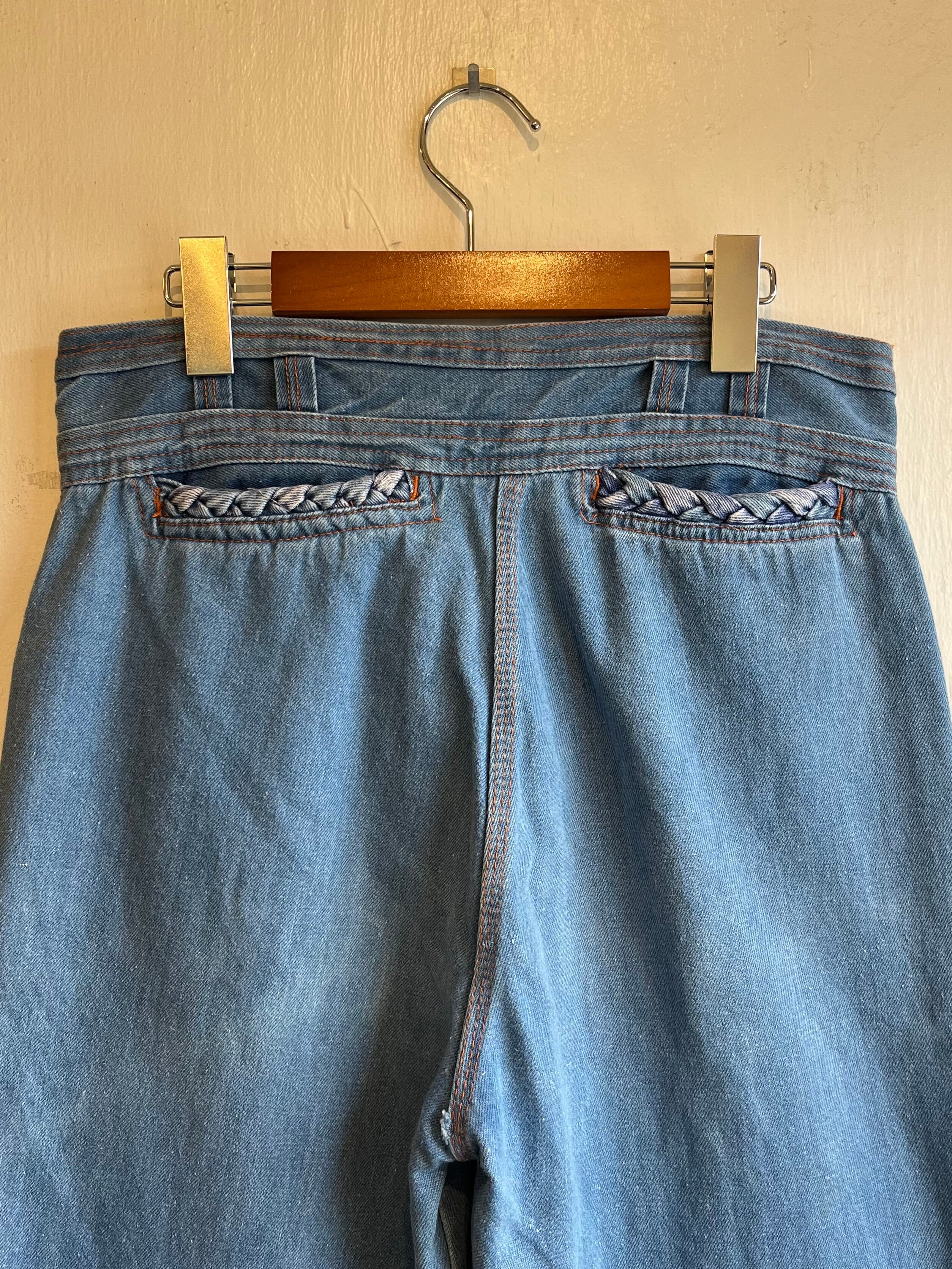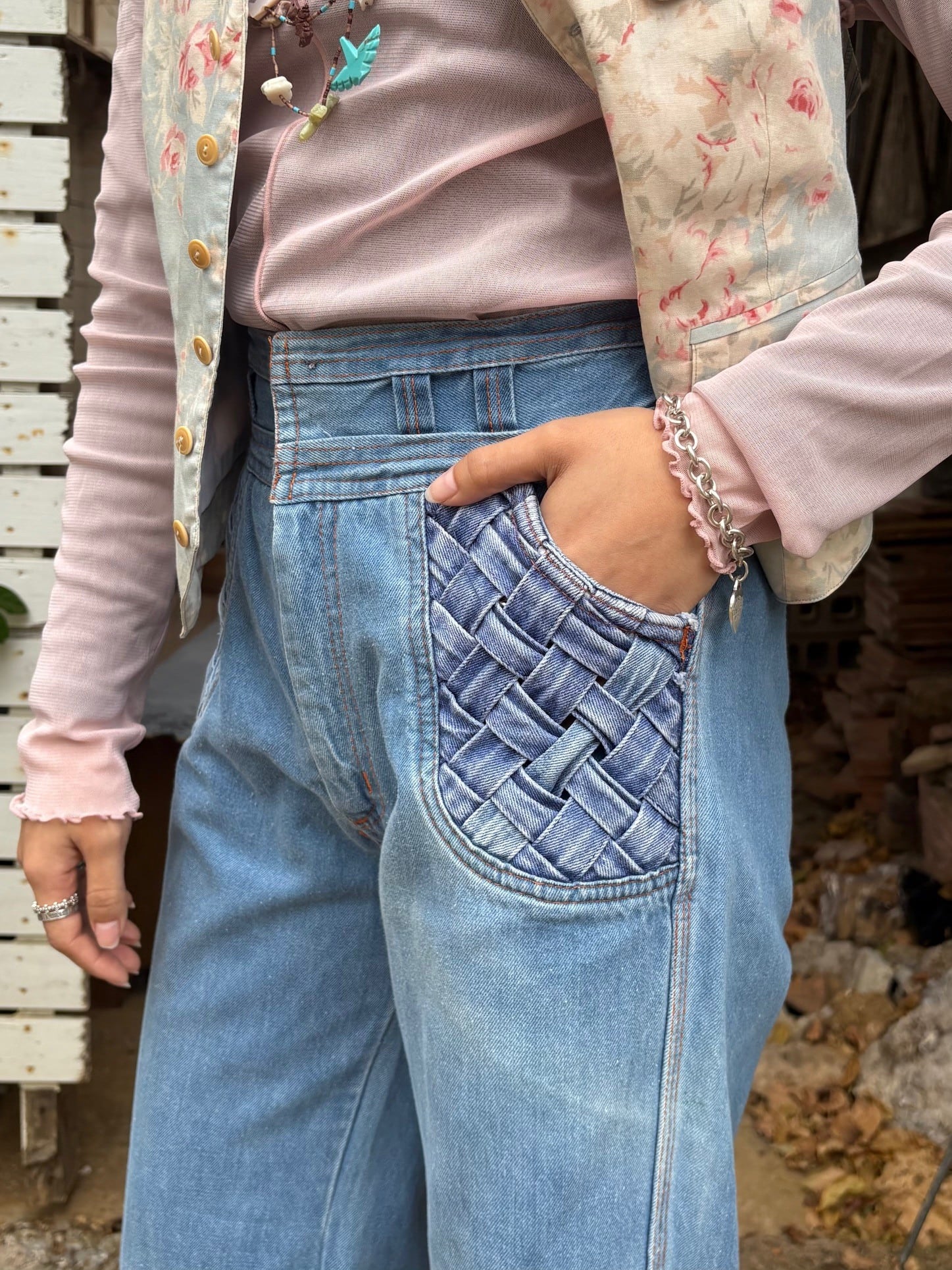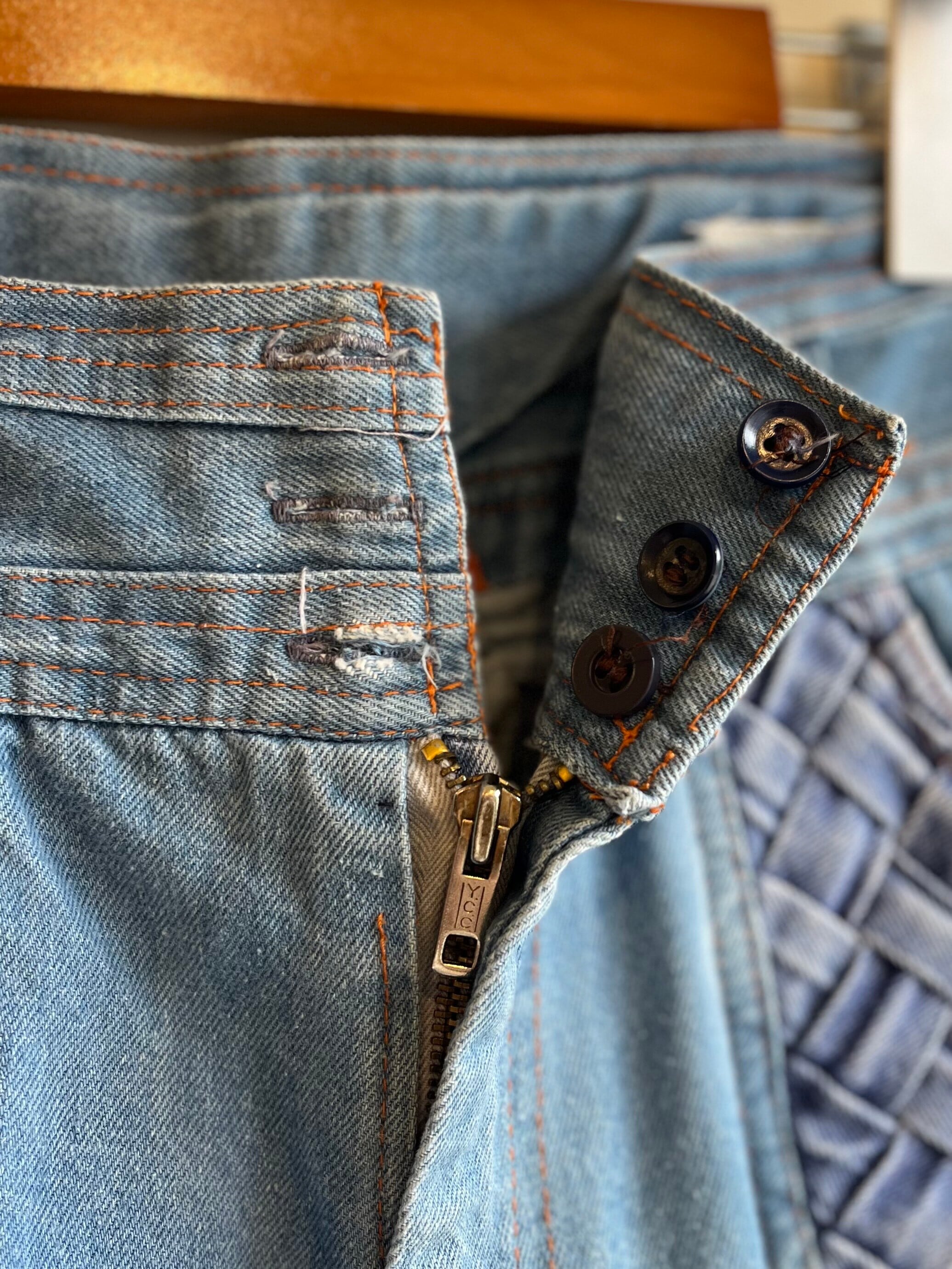 ハイウエスト、バックの玉縁ポケットがシルエットのきれいさを際立たせ、ウエスト周りやポケット部分のデザインがユニークで目を惹く一点となっております。