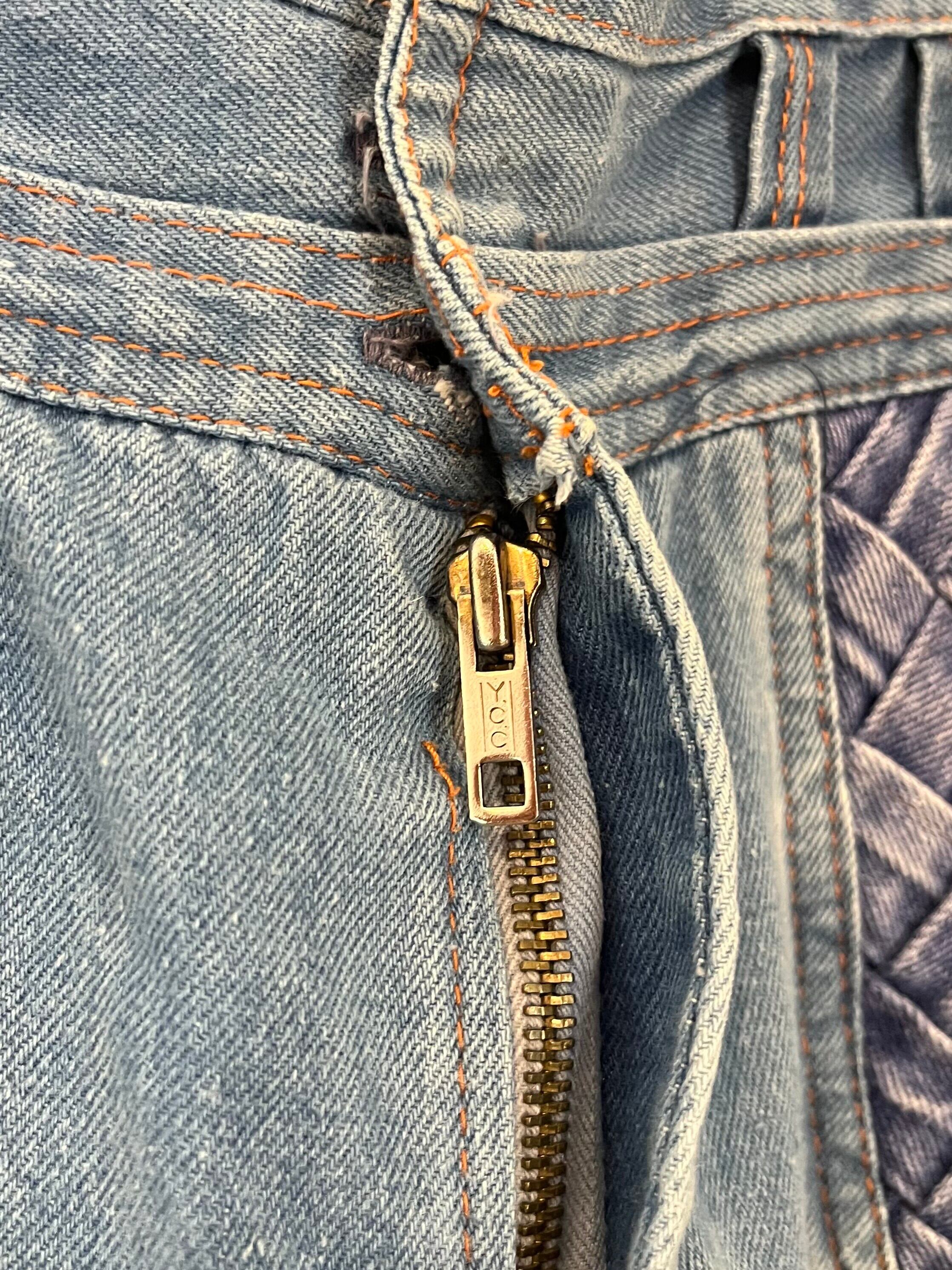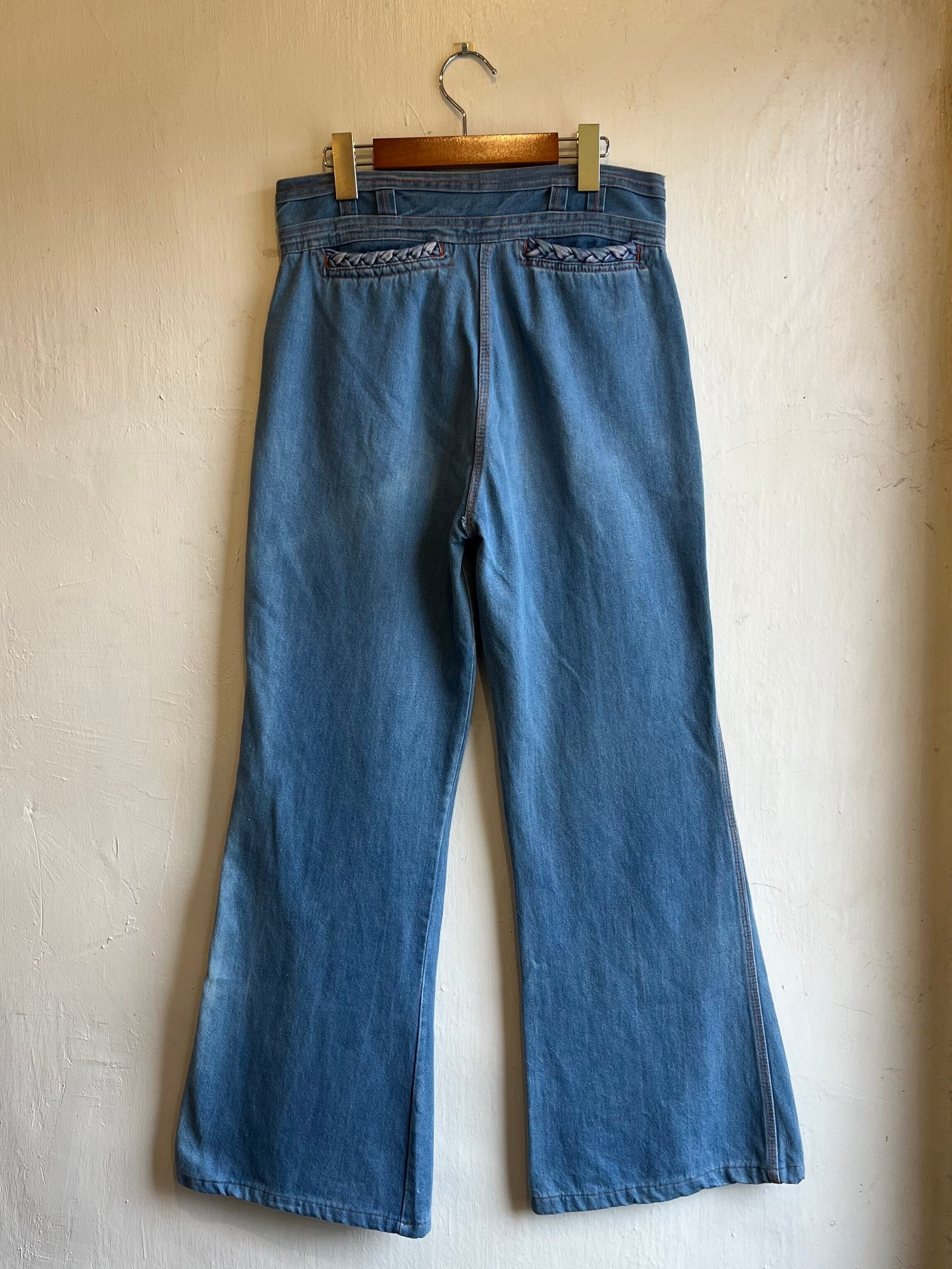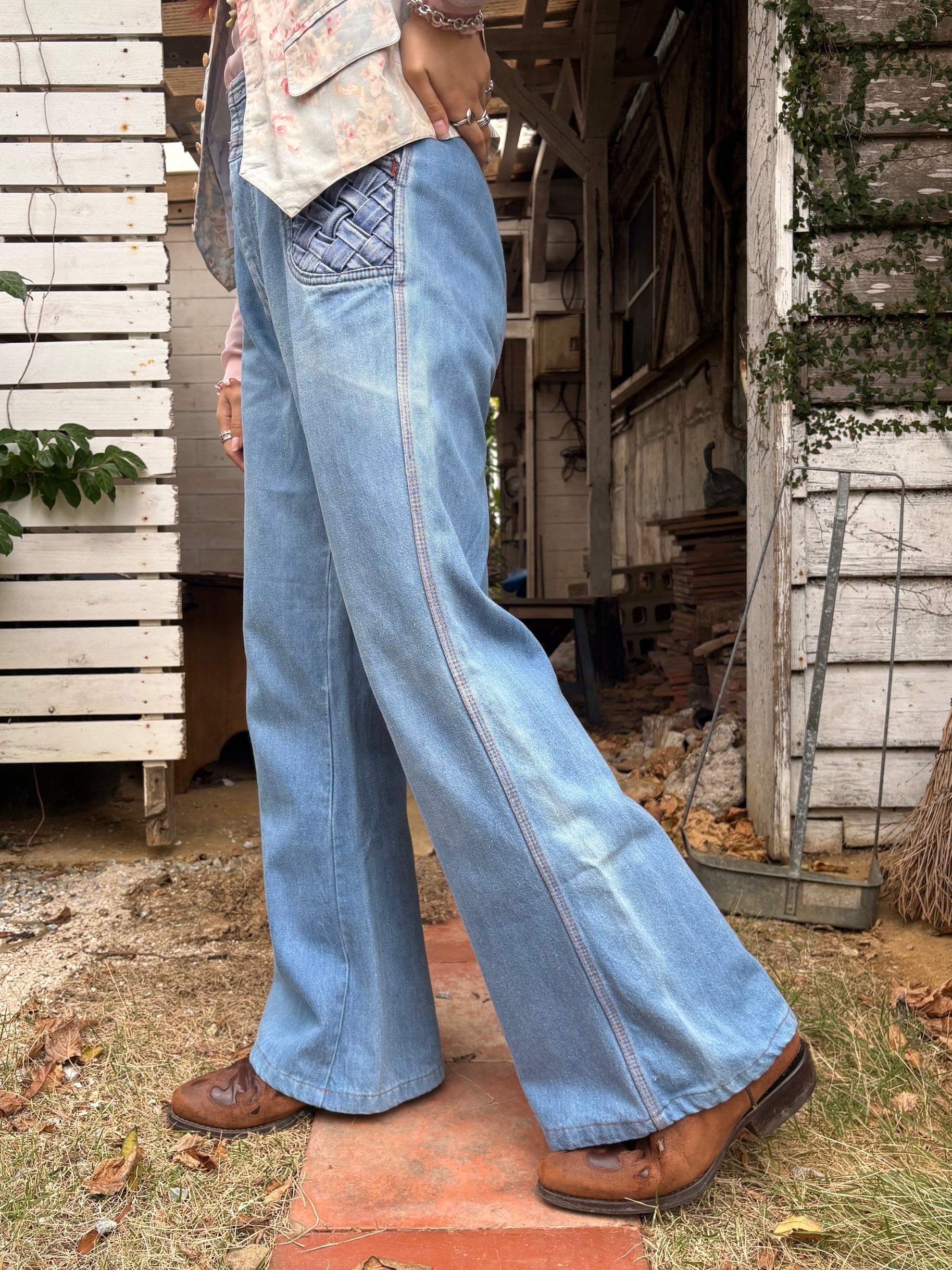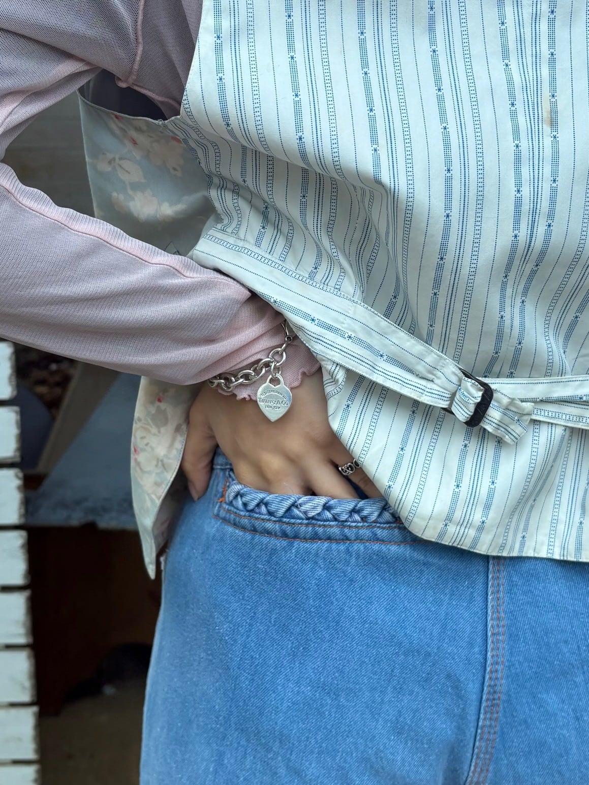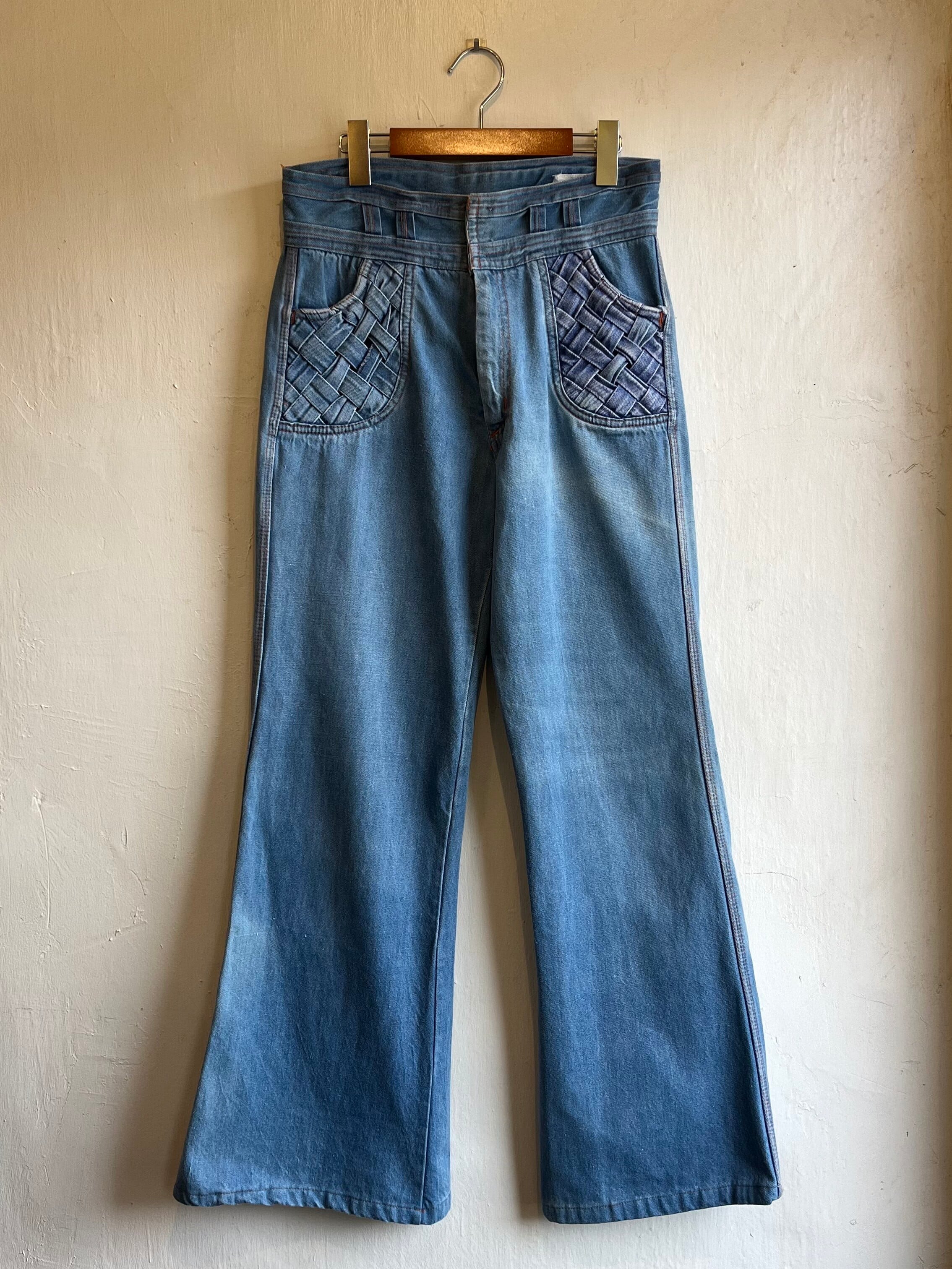 ハイウエスト、バックの玉縁ポケットがシルエットのきれいさを際立たせ、ウエスト周りやポケット部分のデザインがユニークで目を惹く一点となっております。