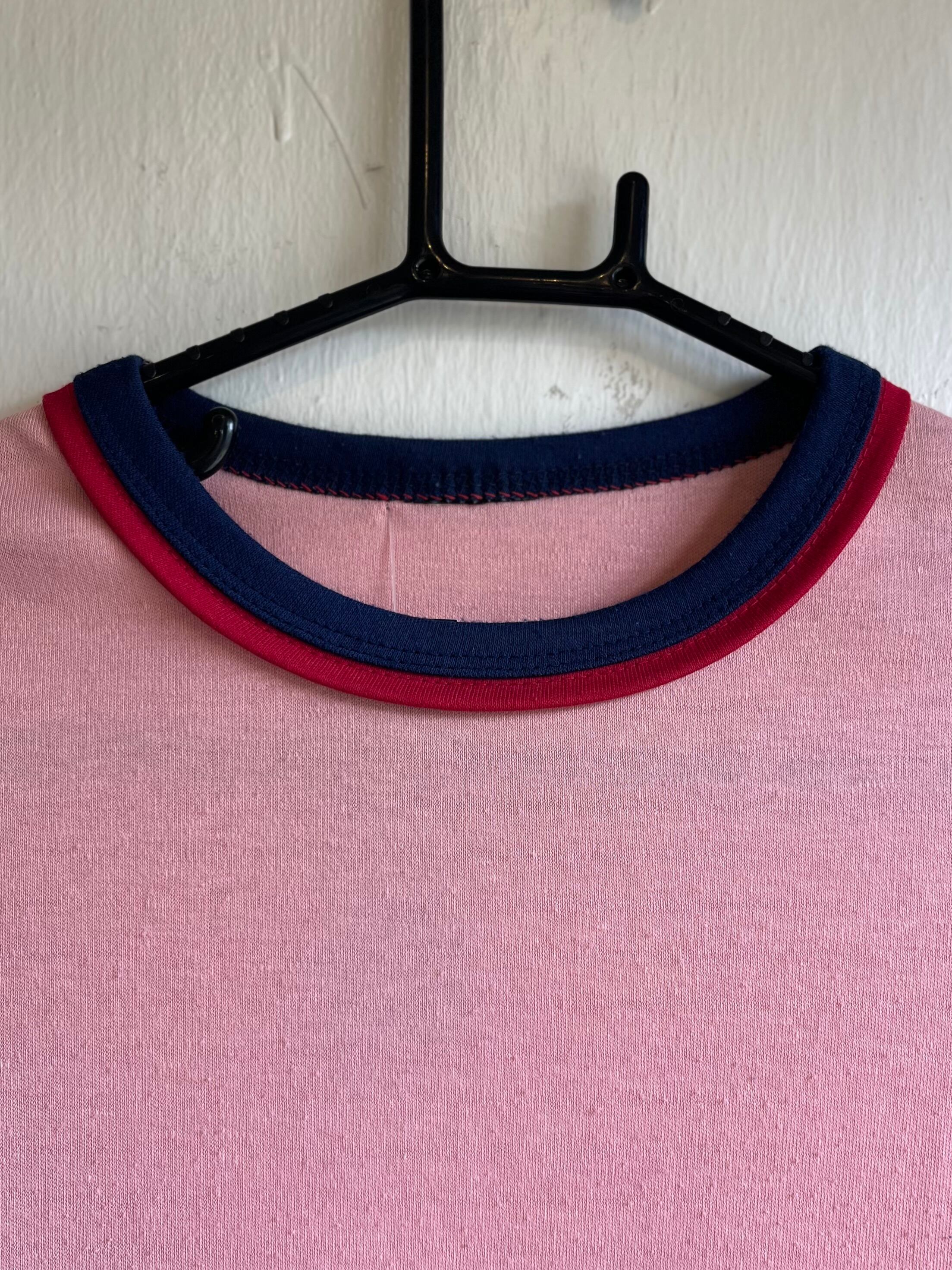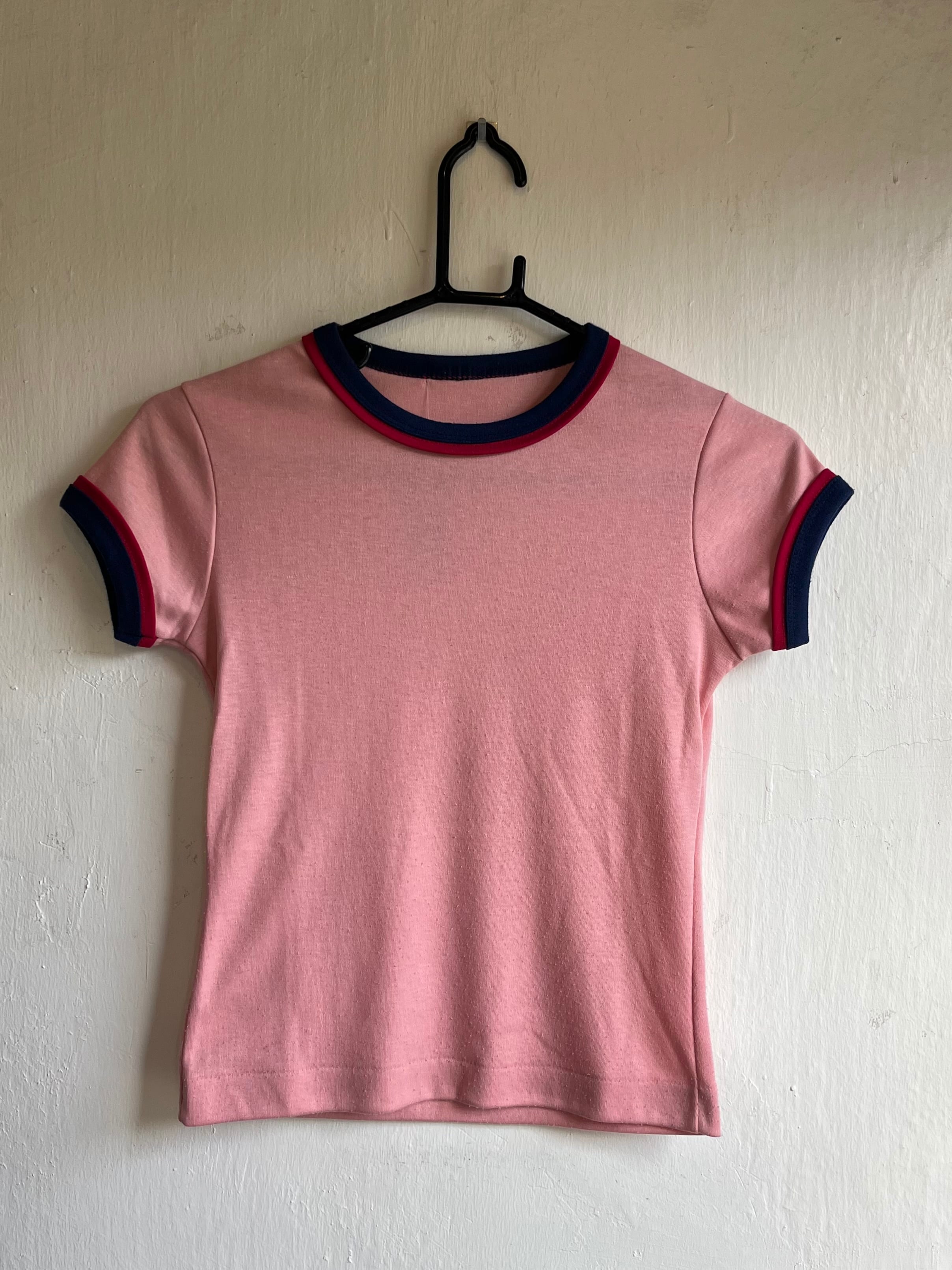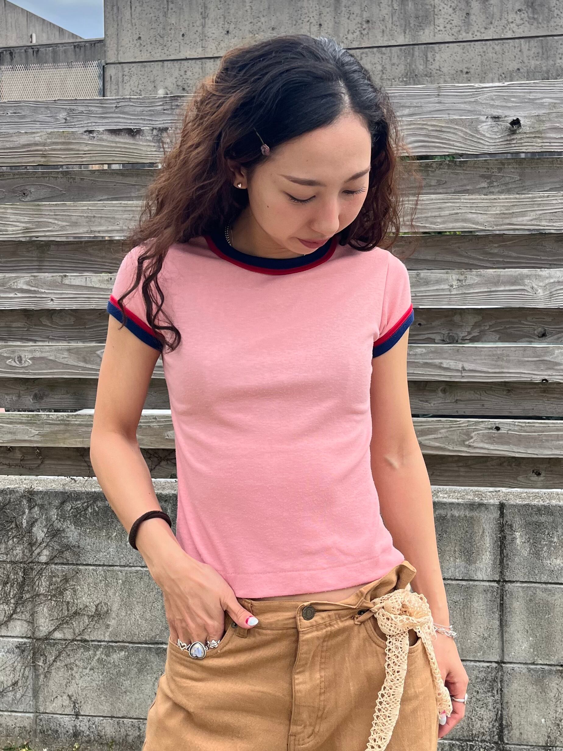 淡いピンクのボディーで、タイトなシルエットですが伸縮性がありボディにフィットするリンガーTシャツです。