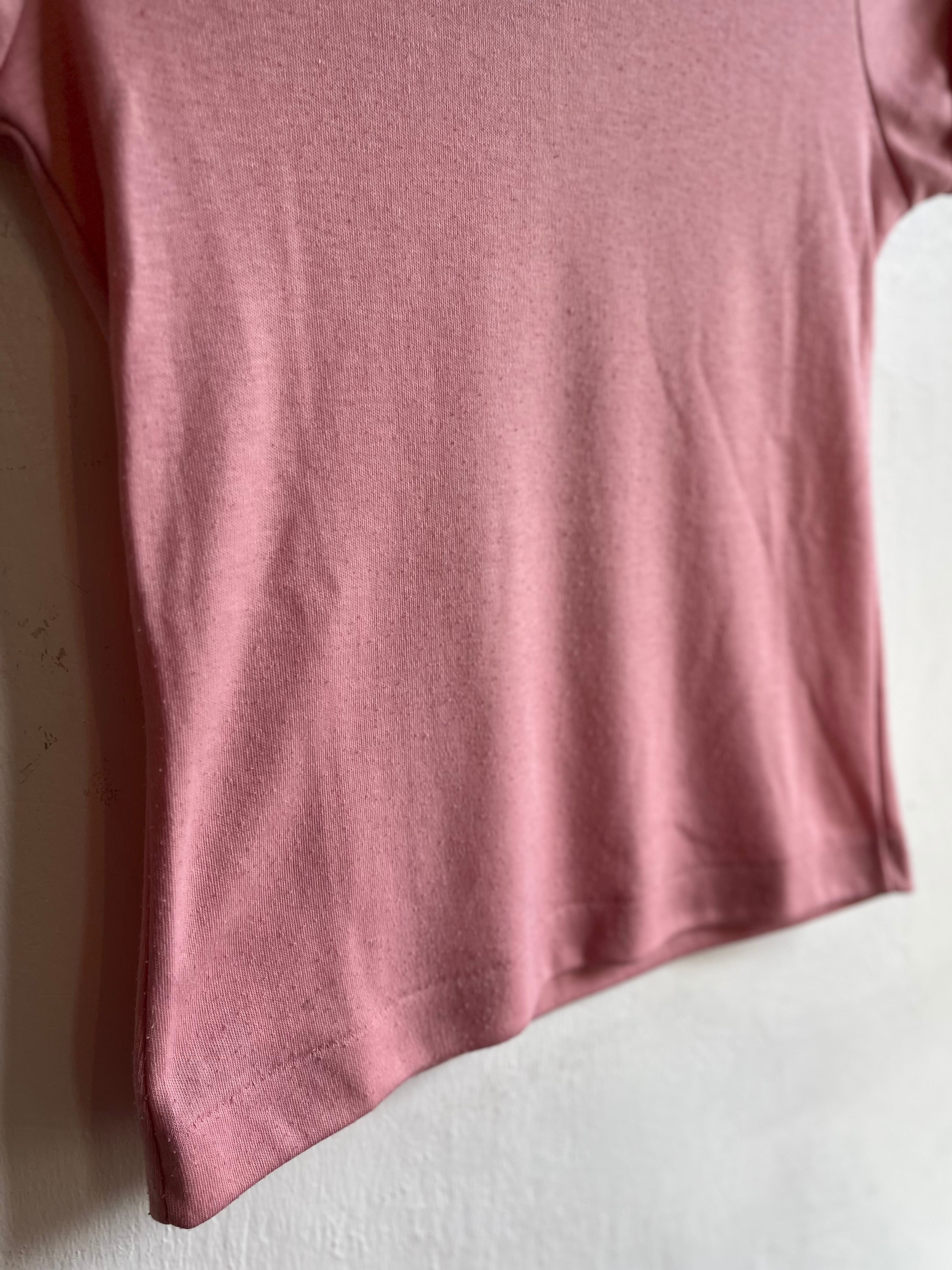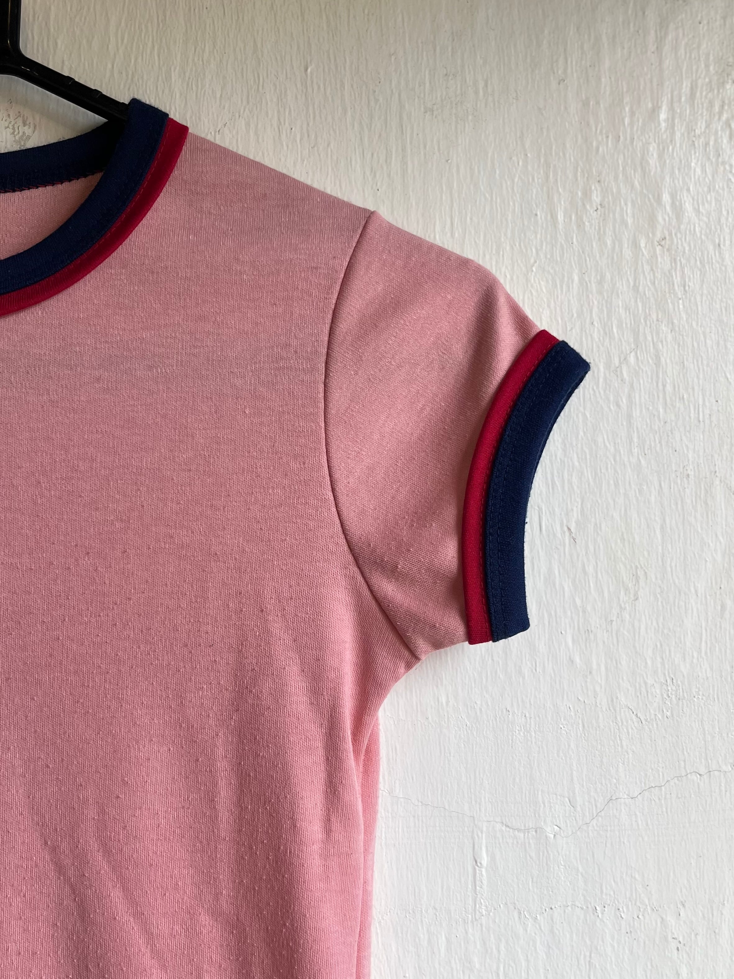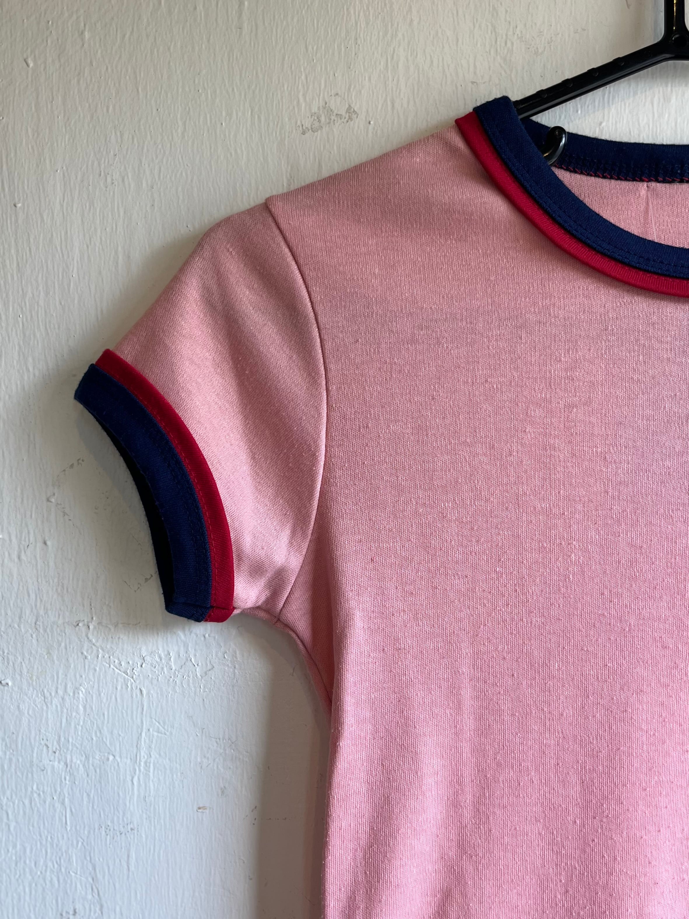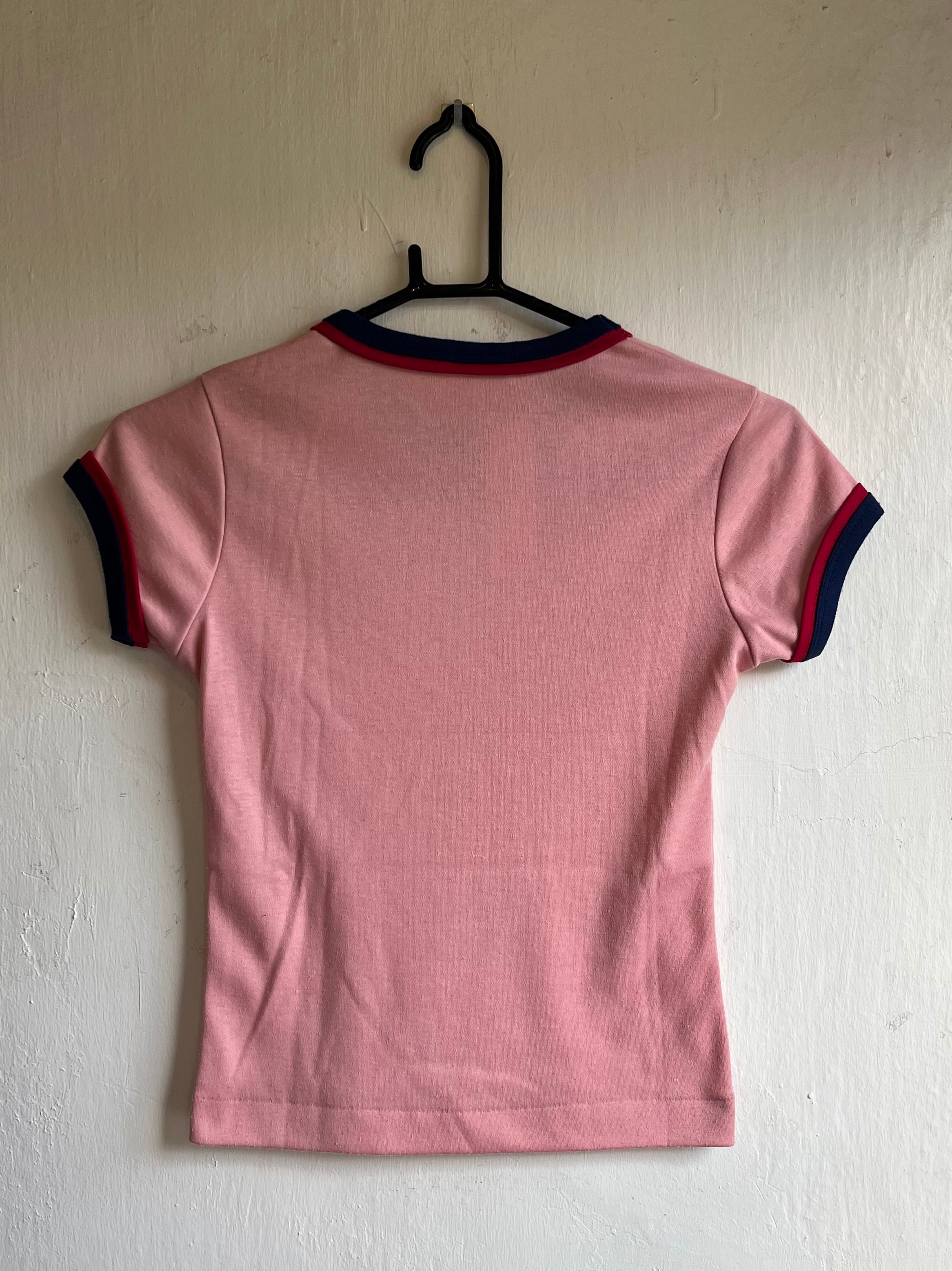 淡いピンクのボディーで、タイトなシルエットですが伸縮性がありボディにフィットするリンガーTシャツです。