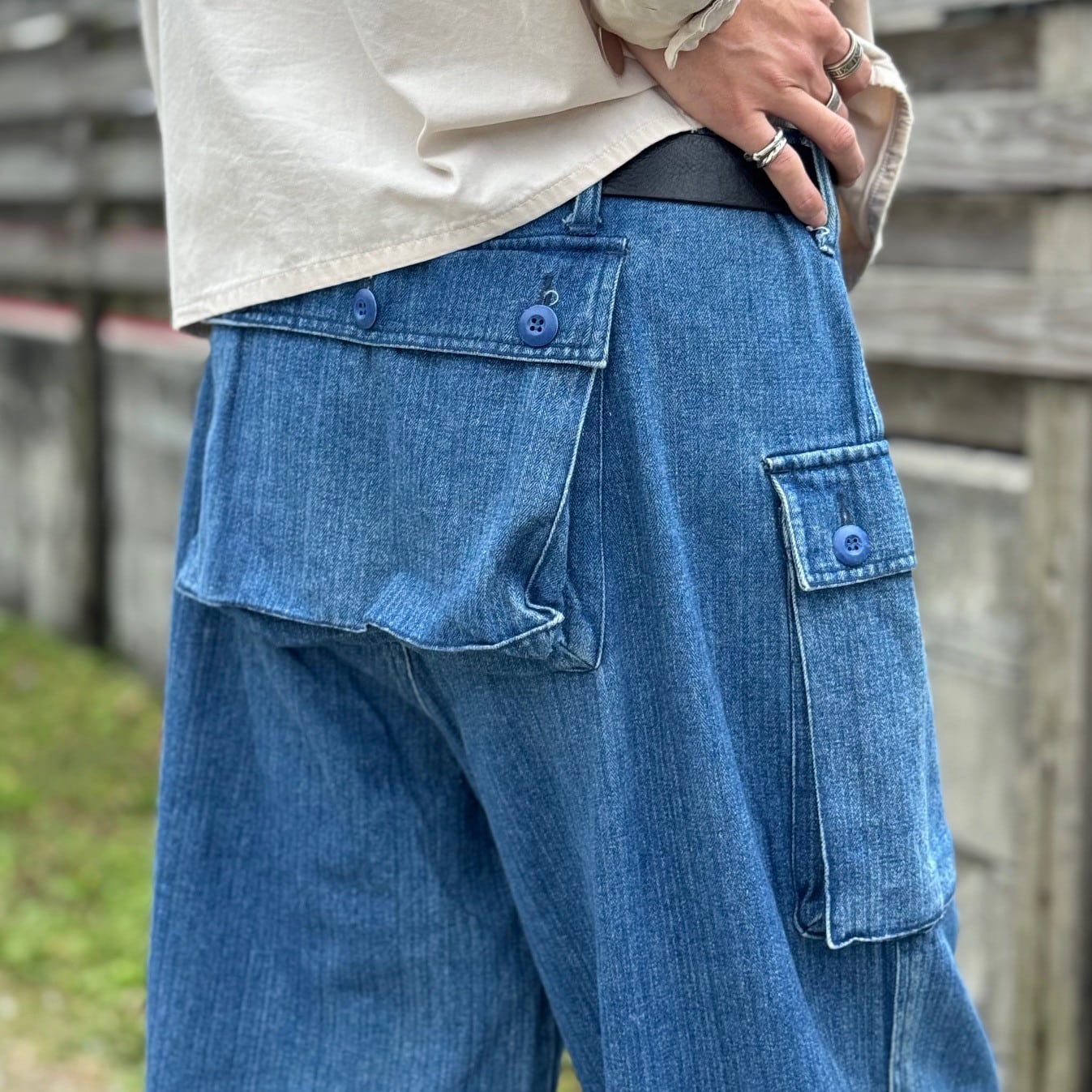 ヒップに配置された大きなポケットと両サイドのカーゴポケットがスタイリングの主役になる存在感を放ちます。