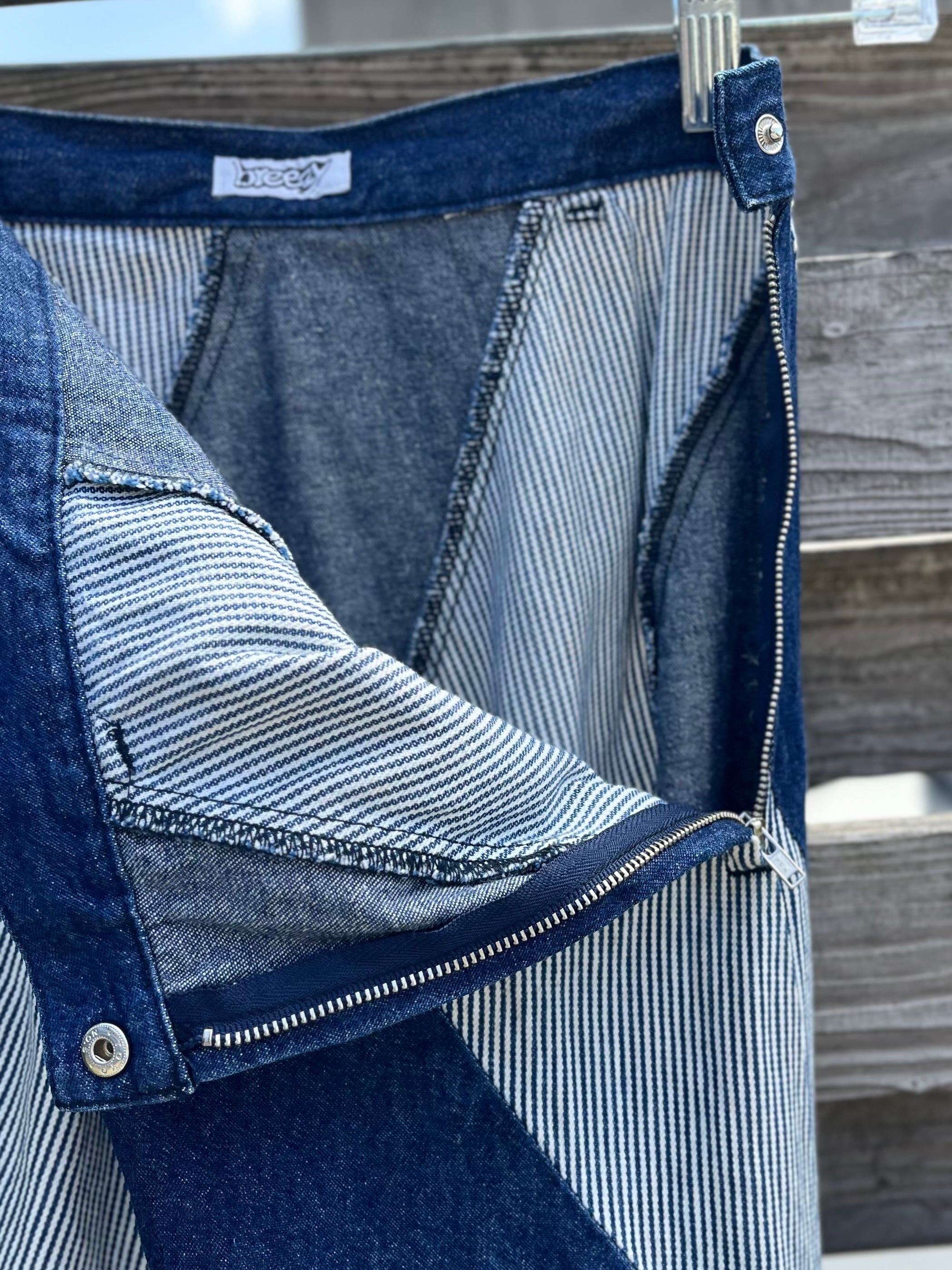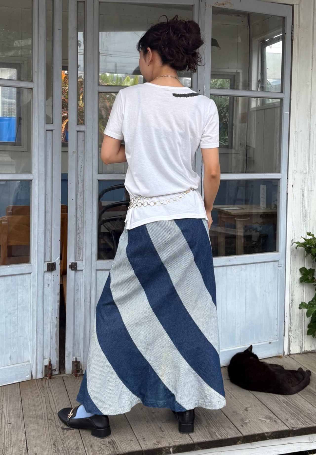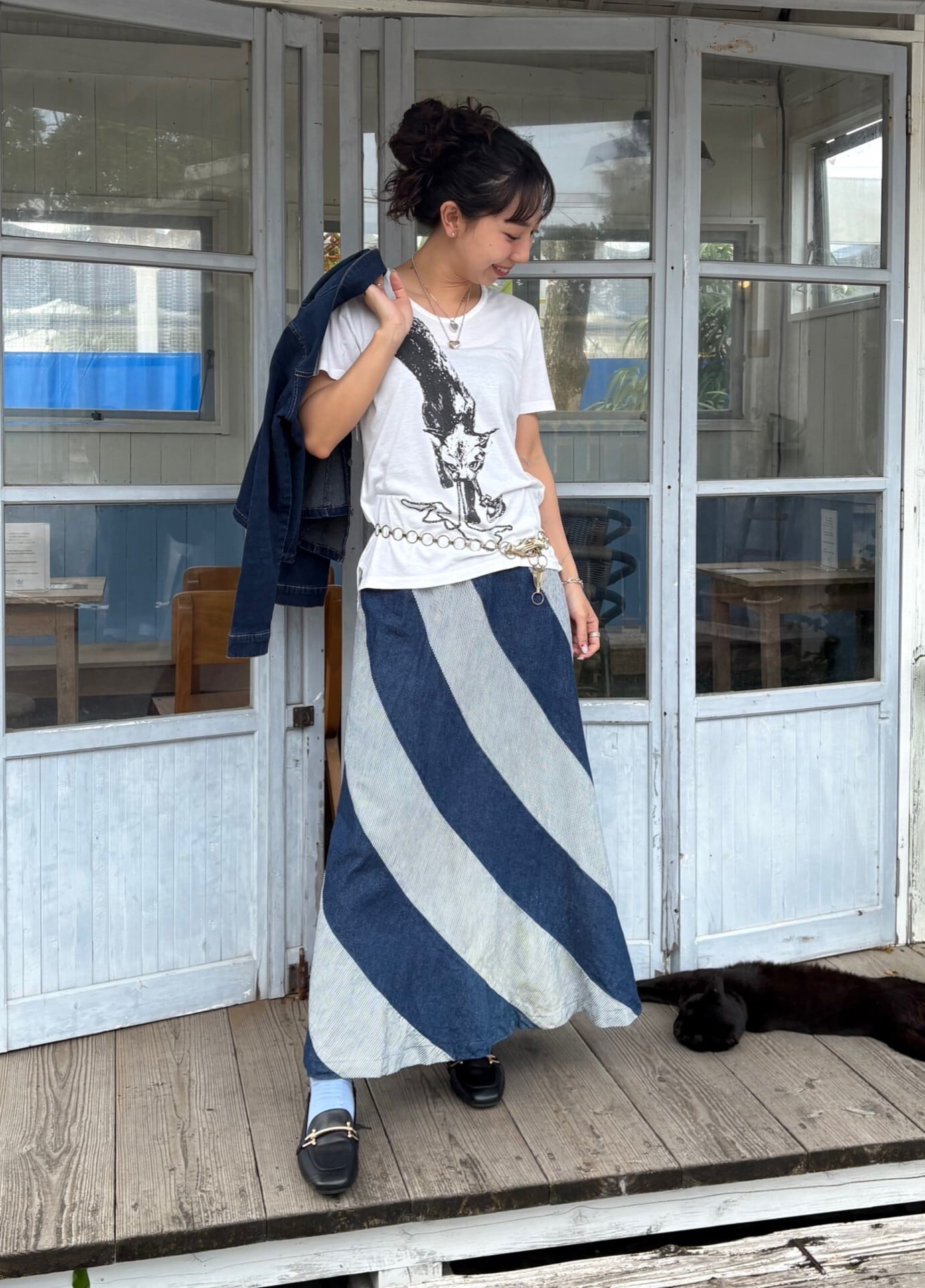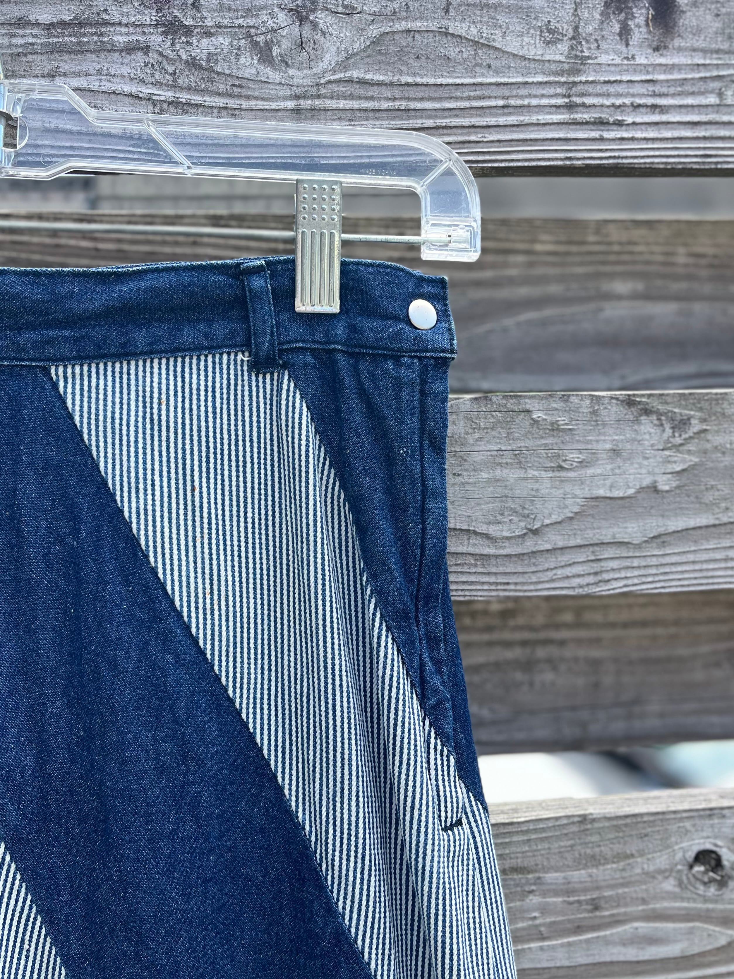 大胆な斜めストライプが目を惹くデニムロングスカート。