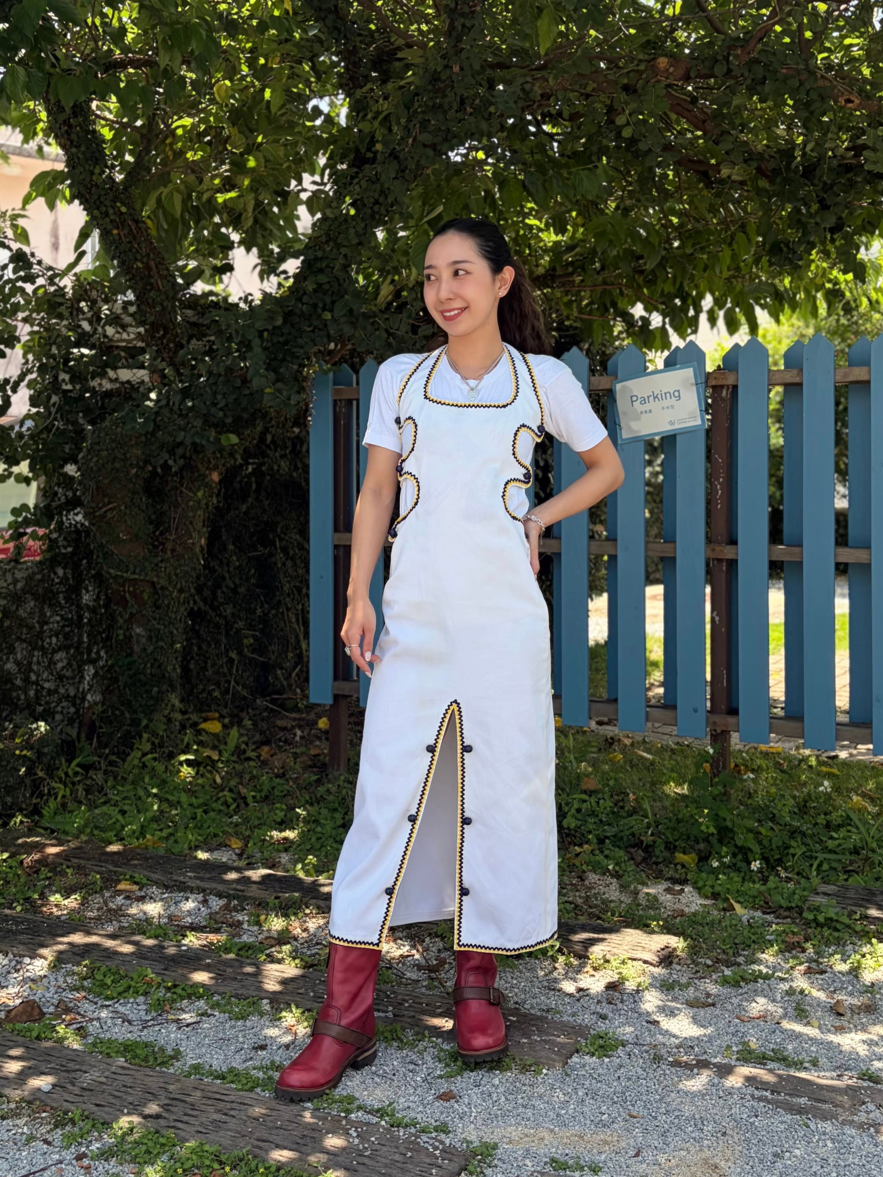上半身からヒップにかけてはややタイトでフィット感がありますが、ざっくりとしたフロントスリットによって歩行時も特に影響は感じられませんでした。